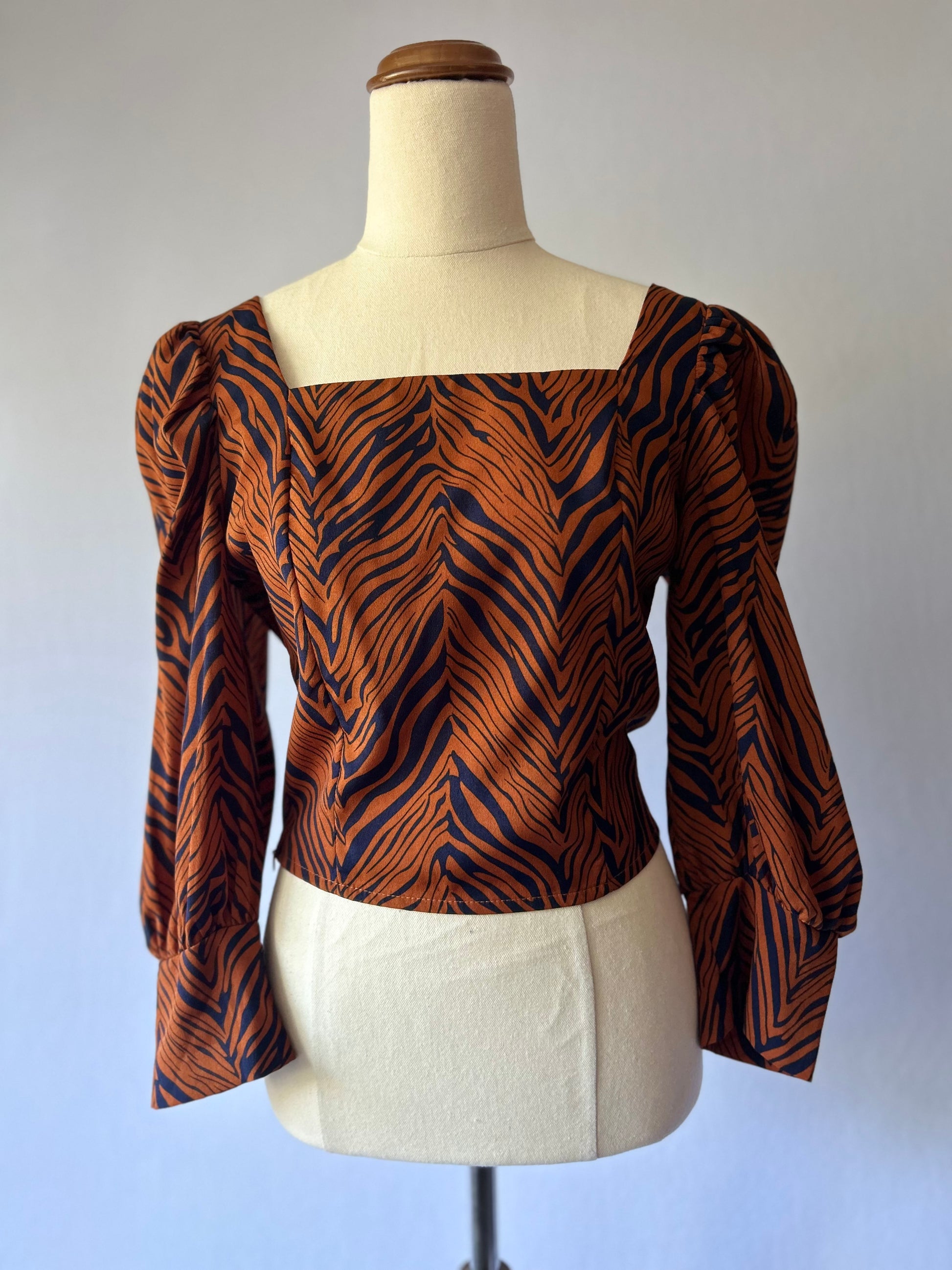 Keywords (SEO): animal print blouse, zebra print top, long sleeve square neck top, sustainable fashion, women’s second hand clothing