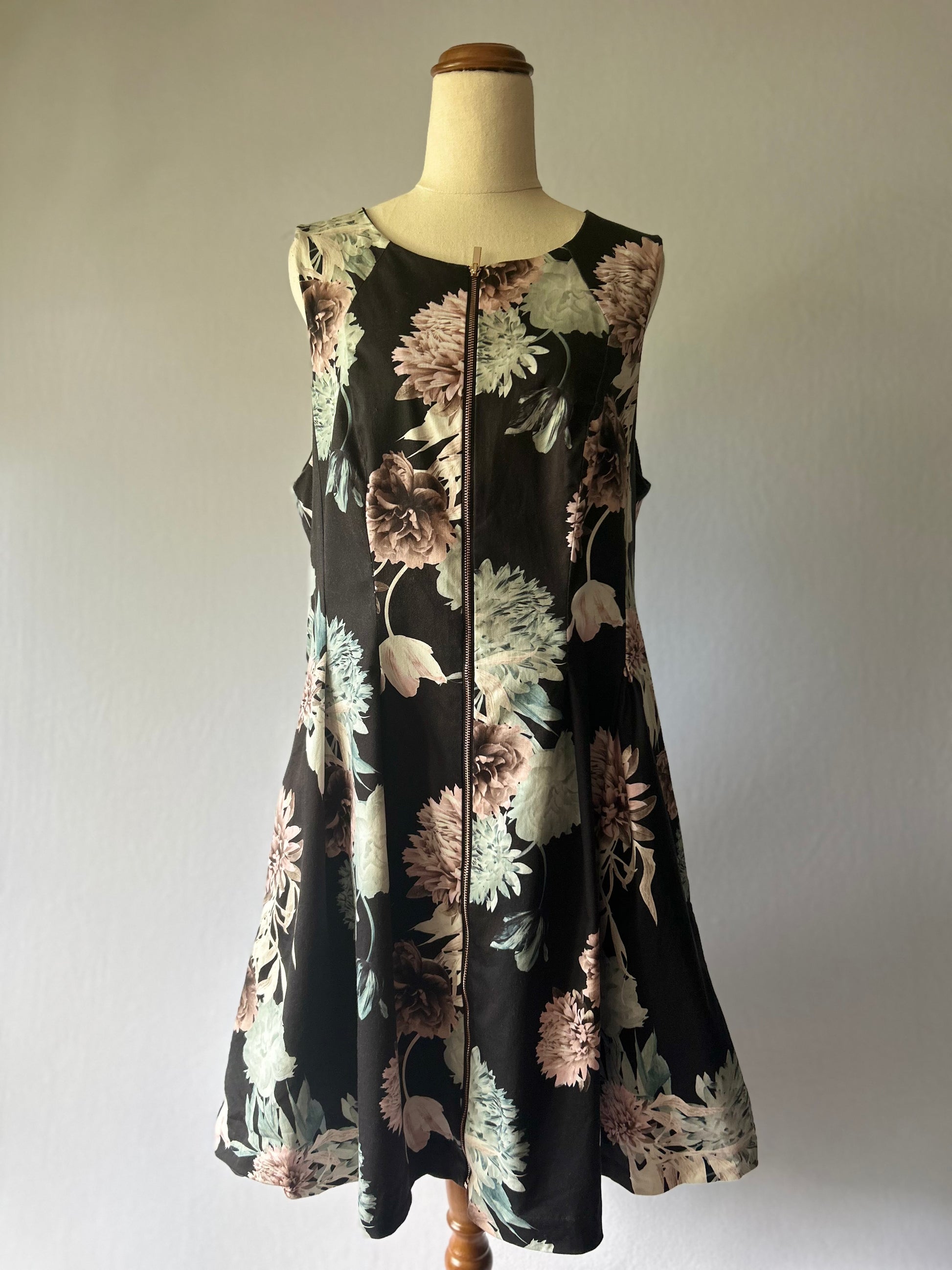 Features: Black floral print, breathable fabric, slight stretch, fully lined, classic feminine fit