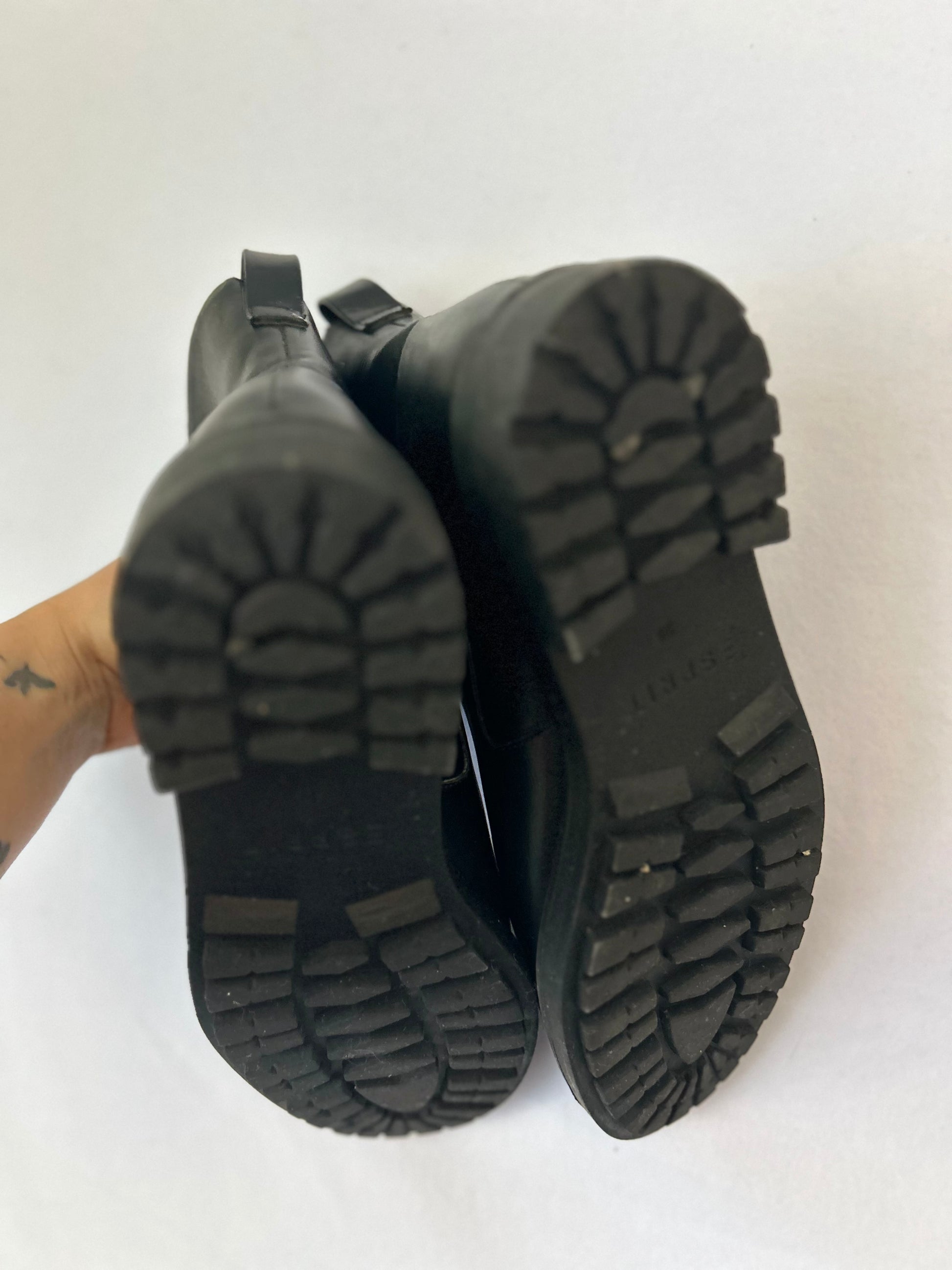 Step into timeless style with these black leather ankle boots, designed with a chunky sole for durability and all-day comfort. Featuring a sleek silhouette and side zip closure, they’re easy to wear and perfect for everyday looks or dressing up an outfit. Size EUR 39, these boots are a versatile staple for any sustainable wardrobe.