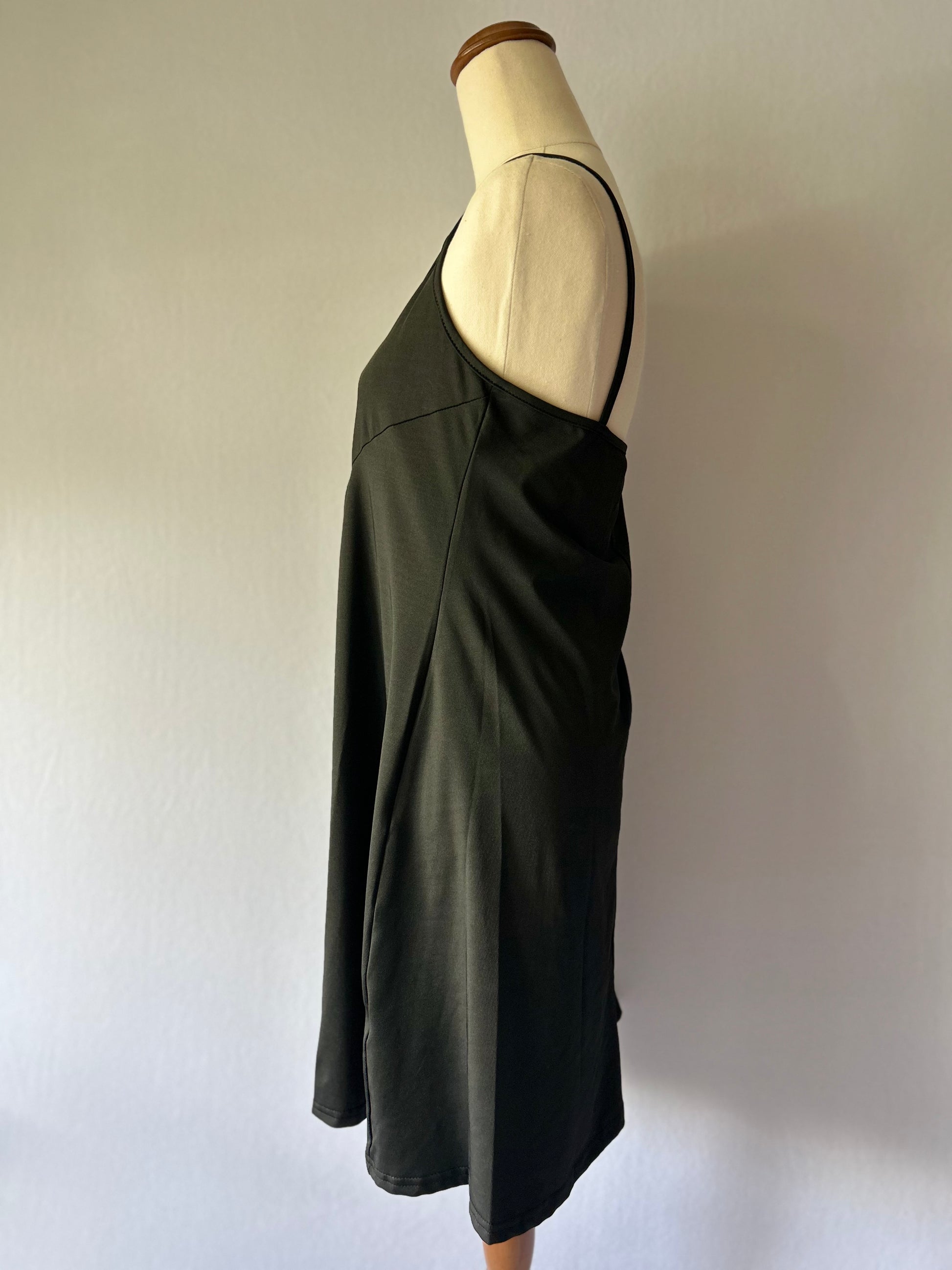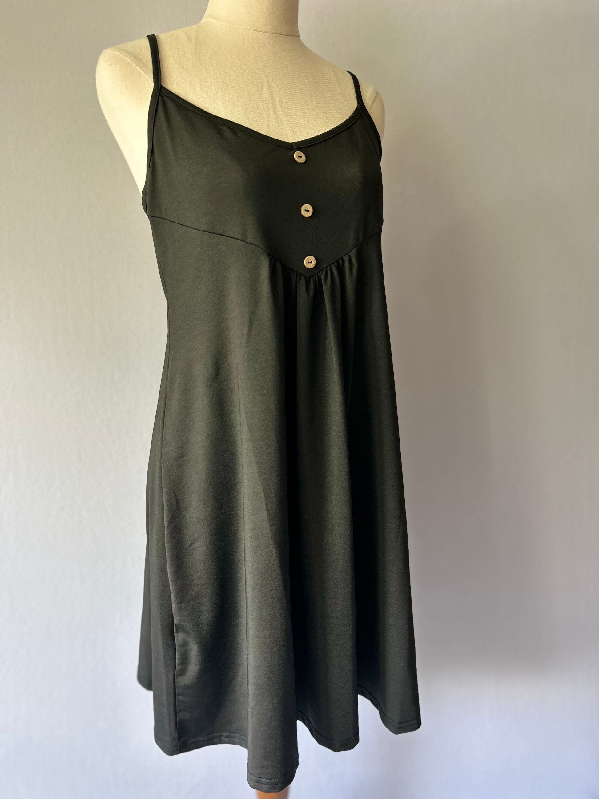 This sweet and stylish slip-style mini dress is tagged as a size M. It features a flattering V-neckline and delicate spaghetti straps, perfect for layering or wearing alone on a warm day. The dress has a subtly gathered Empire waist, creating a flowy and comfortable fit through the skirt. Decorative natural wooden buttons detail the bodice, adding a charming, rustic contrast to the sleek black fabric. Made from a soft, easily drapable Polyester blend, this piece is a versatile wardrobe staple for casual events or dressing up.