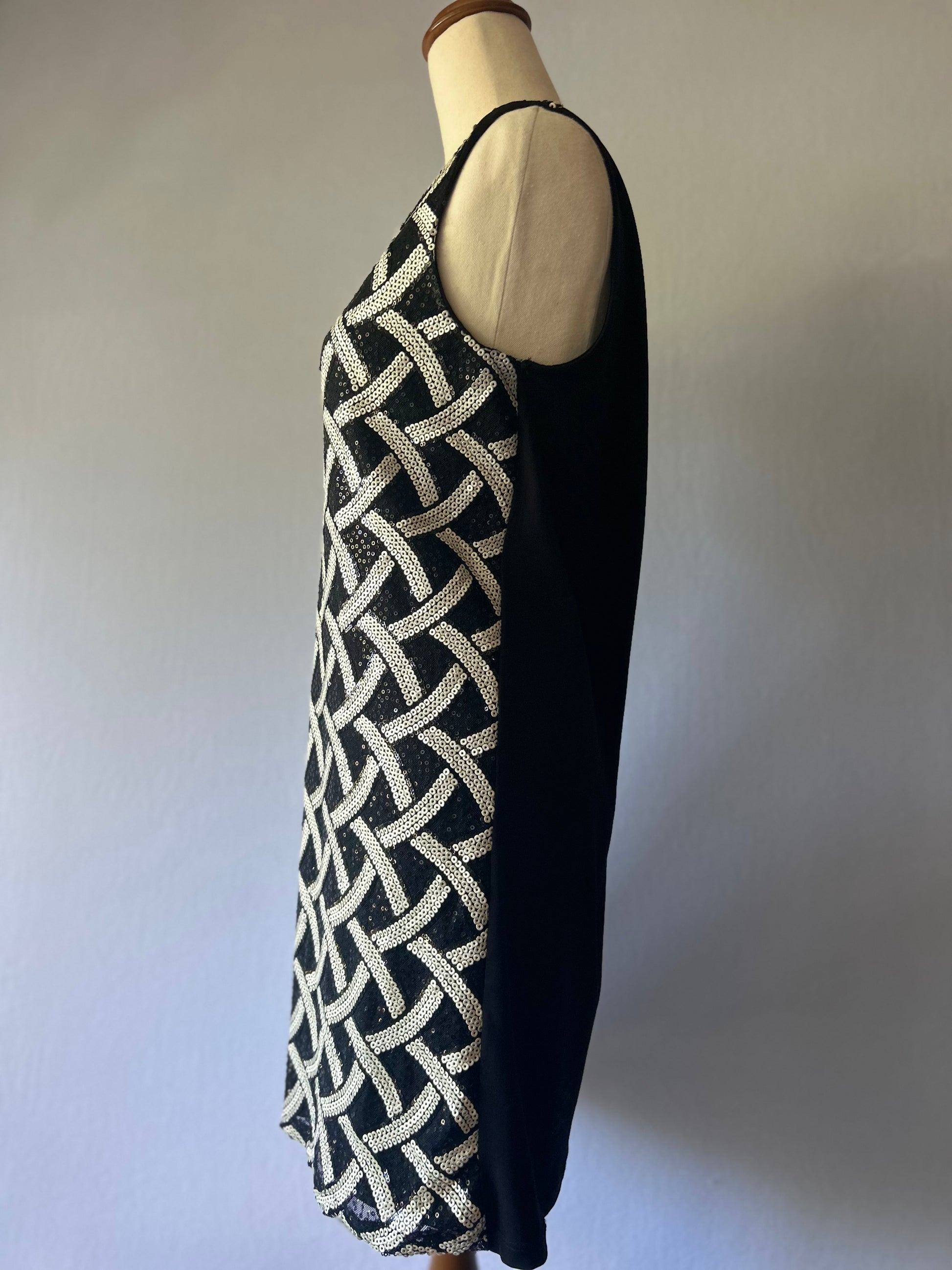 Turn heads with this stunning black dress featuring an intricate silver sequin pattern. Designed in a flattering sleeveless silhouette, this piece brings effortless elegance to any evening event, summer party, or special occasion.