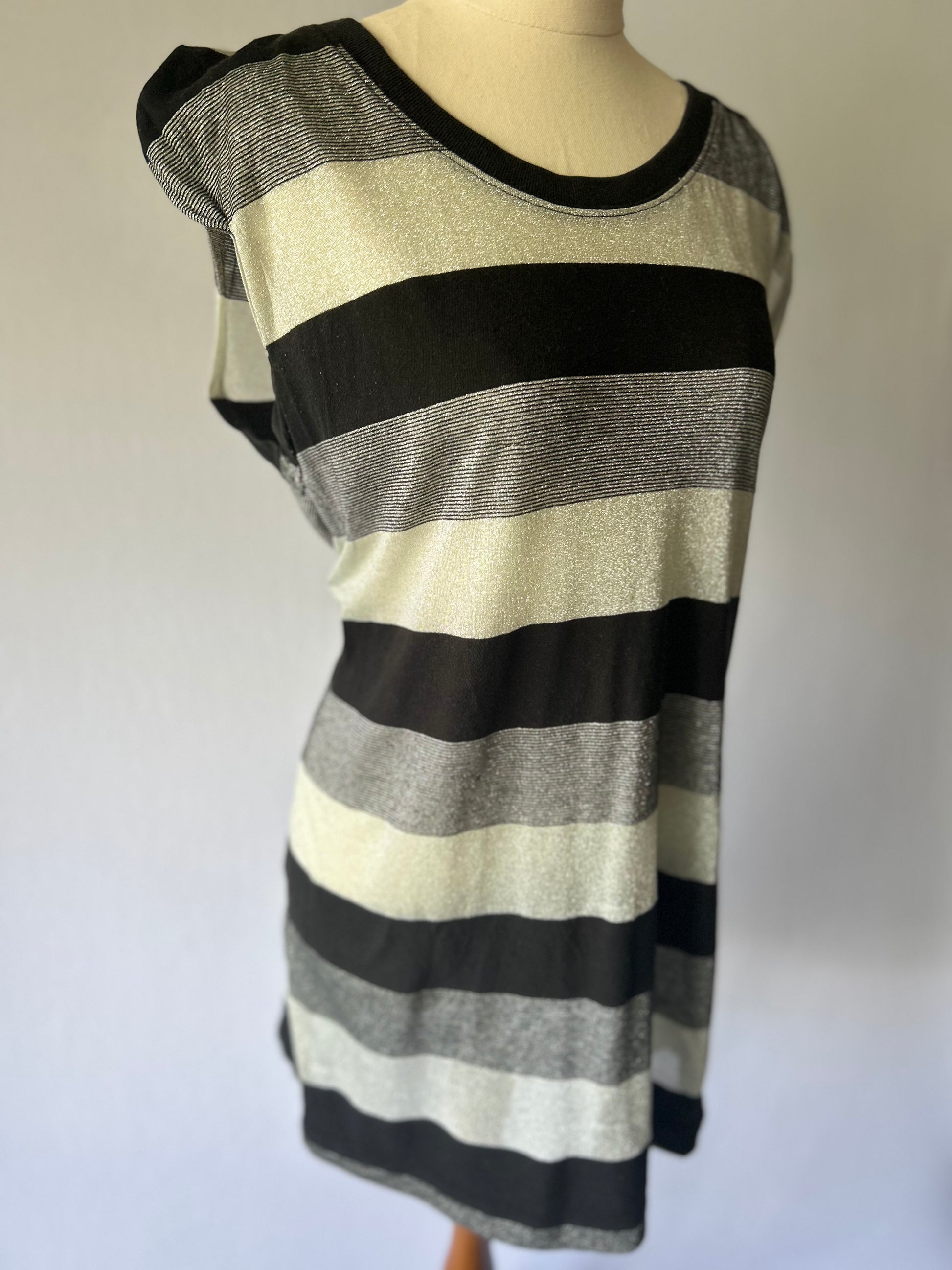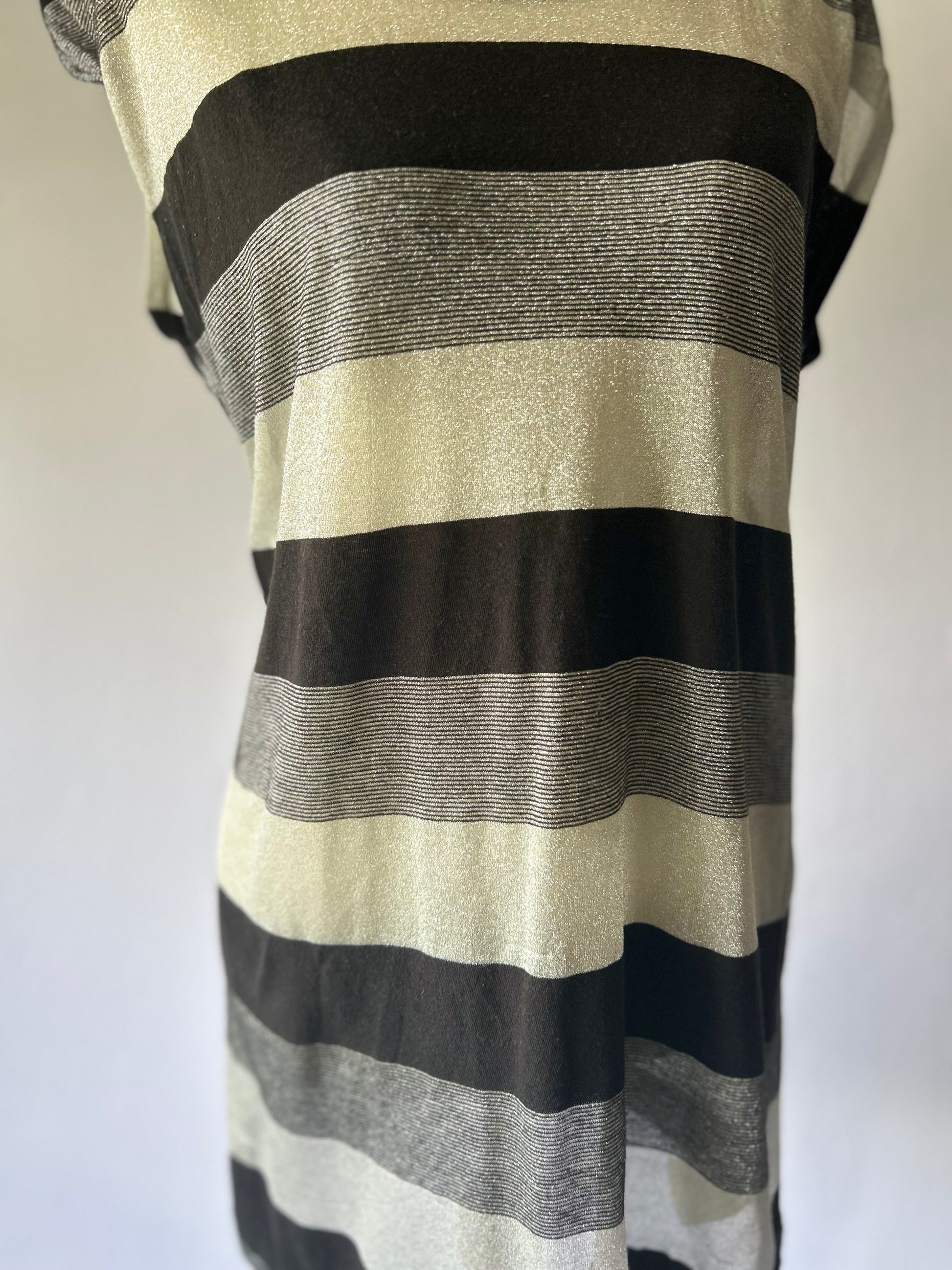 Add a touch of shine to your everyday style with this black and silver striped top. Crafted in a soft cotton blend (55% cotton), it features a relaxed fit, round neckline, and short sleeves for easy comfort. The metallic shimmer in the stripes makes it versatile enough to dress up for an evening out or keep casual with jeans.