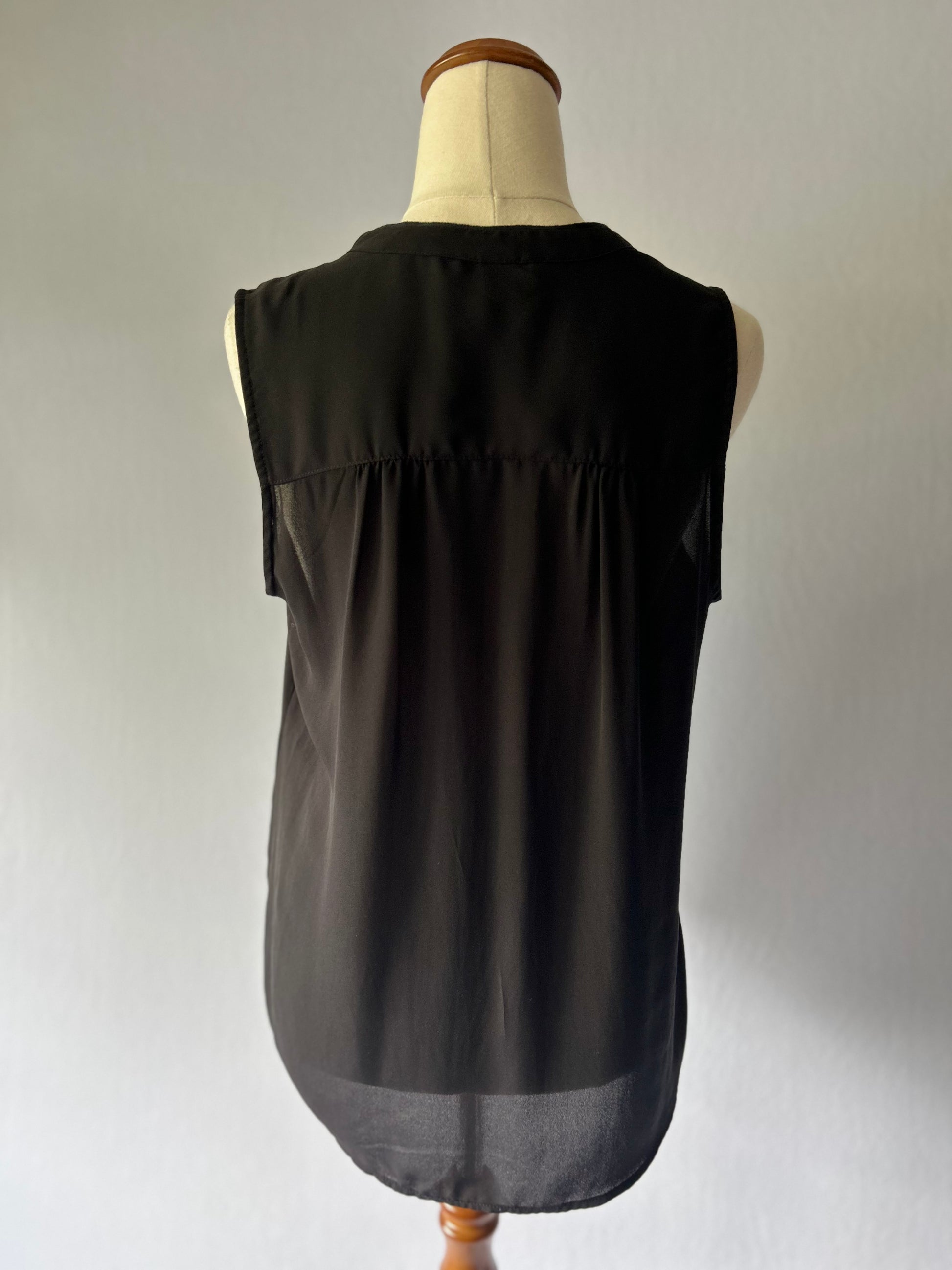 This chic, sleeveless blouse is tagged as a size EUR 36 / US 6. It features a classic, deep V-neckline with a partial button placket, creating an effortless, slightly sheer look. The silhouette is relaxed and slightly flowy, designed to be comfortable and easily tucked or worn loose. Practical details include two small flap pockets on the chest. Made from Polyester, the fabric has a lightweight, chiffon-like drape, making this black top a versatile staple for work, layering, or smart-casual evening wear.