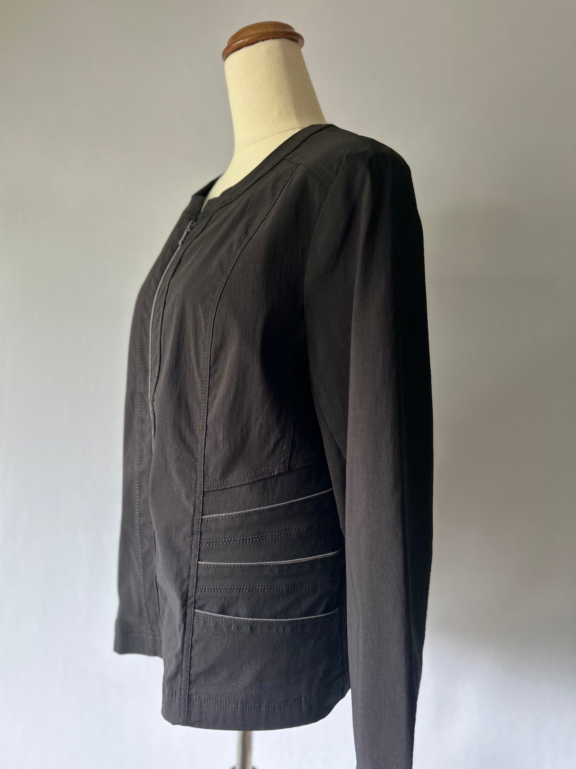 Crafted from a quality blend of 75% viscose, 21% nylon, and 4% spandex, this jacket offers a soft drape with just the right amount of stretch. The zip-up front and minimalist round neckline give it a modern edge, while the stitched panel details add shape and texture.