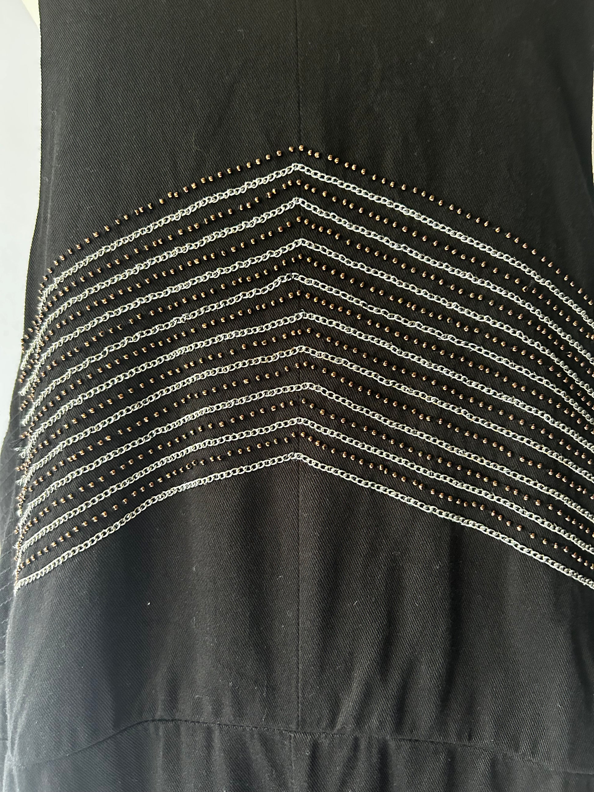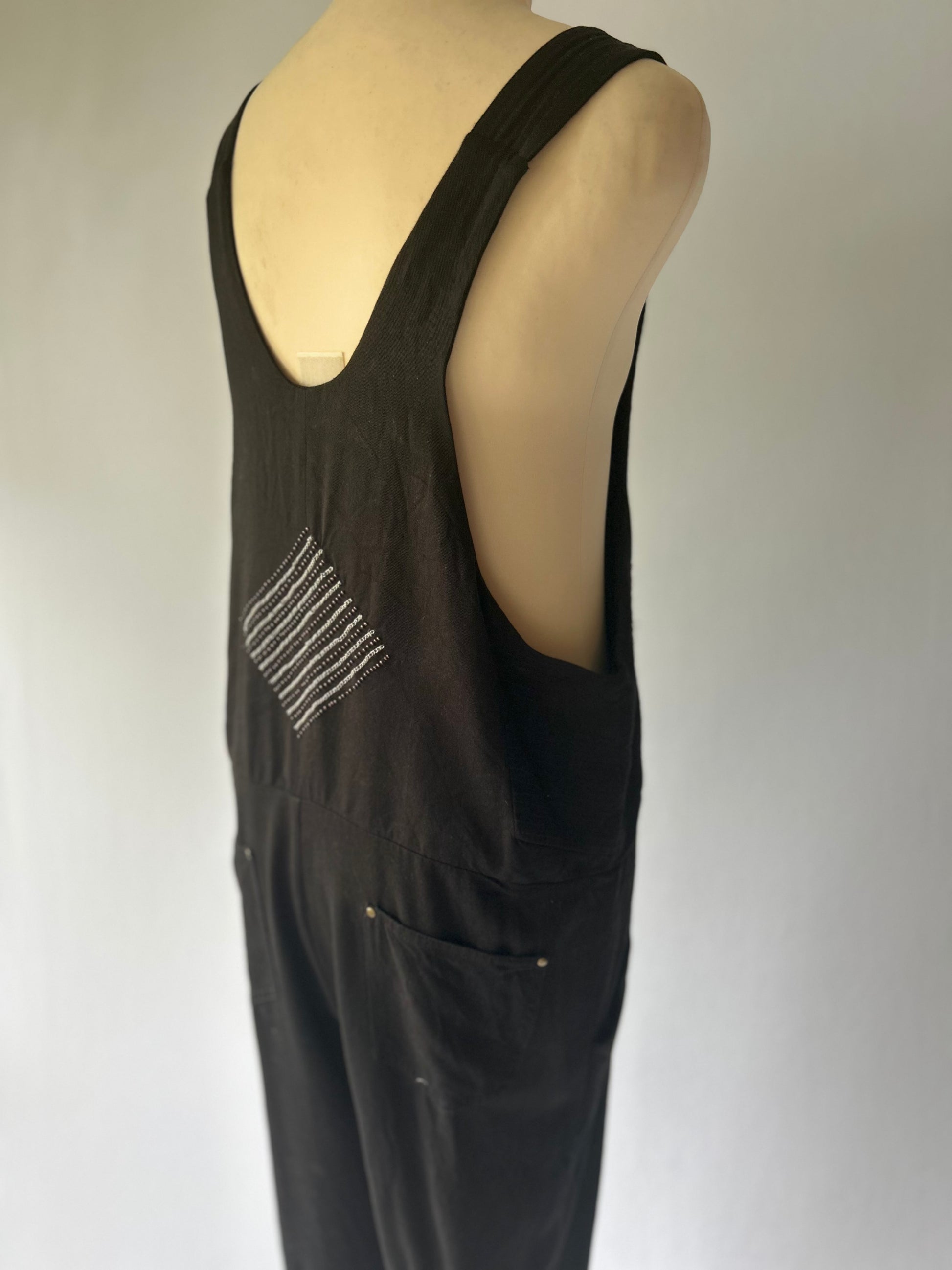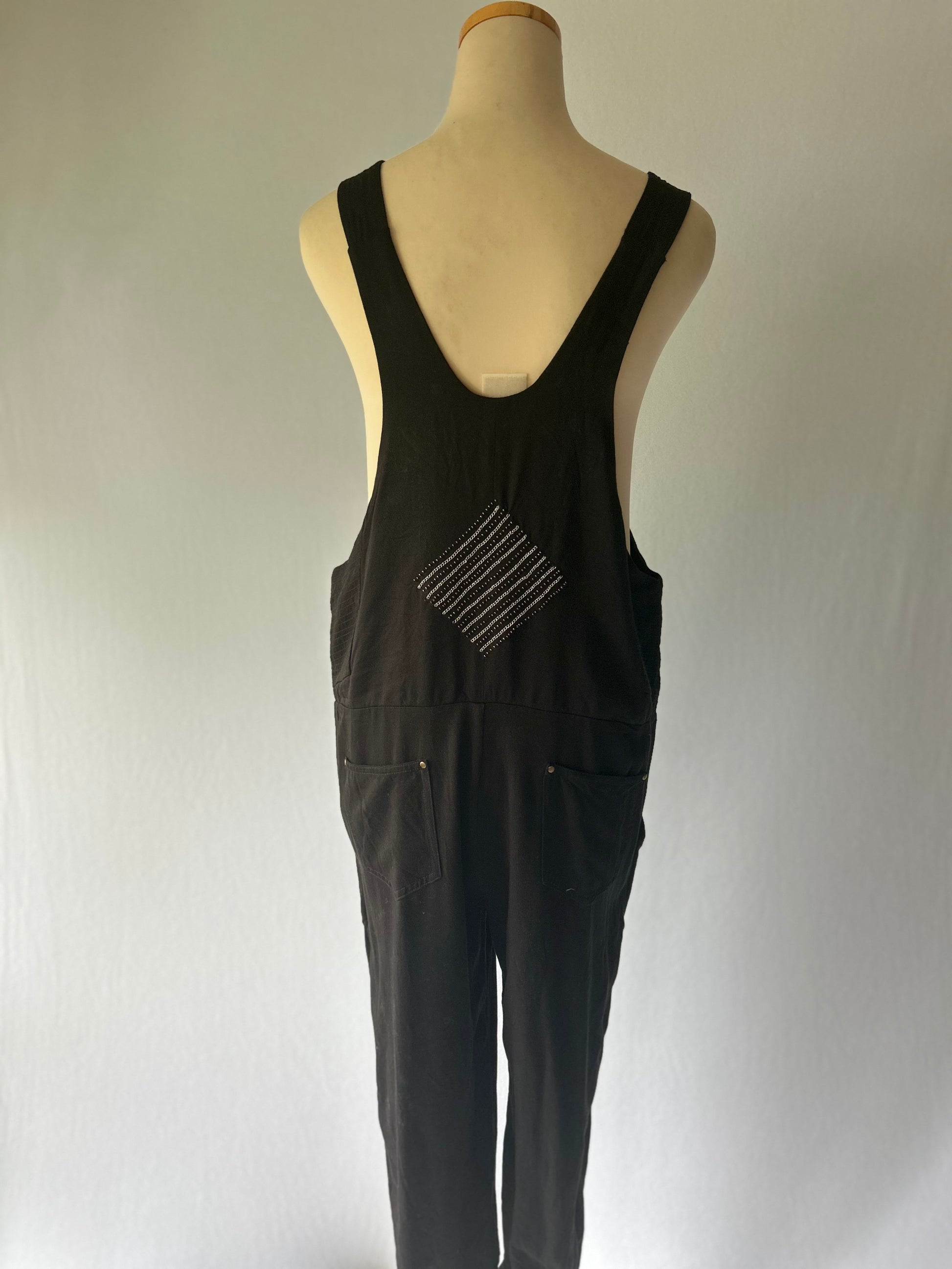 Elevate your casual wardrobe with this chic and sustainable black jumpsuit. Crafted from 100% Tencel, this piece offers a silky-soft touch and a beautiful drape that feels luxurious against the skin. The front features a unique silver-toned chevron embroidered detail, adding a touch of modern flair to a classic silhouette.