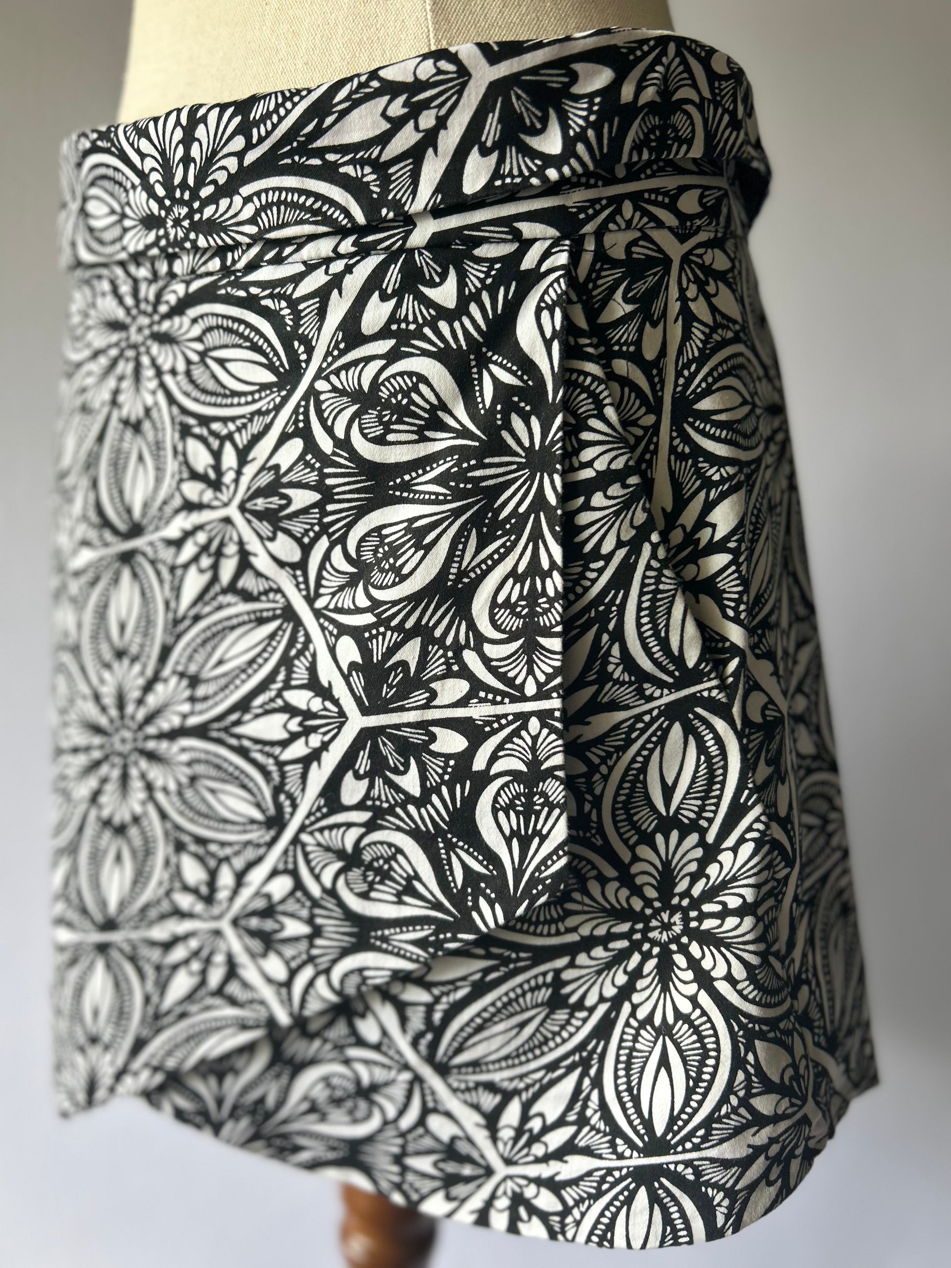 Make a statement with this black and white patterned skirt in size 10, crafted from a soft cotton blend with a touch of stretch for comfort and ease. The bold, intricate print adds a unique edge, while the A-line silhouette creates a flattering and versatile fit.