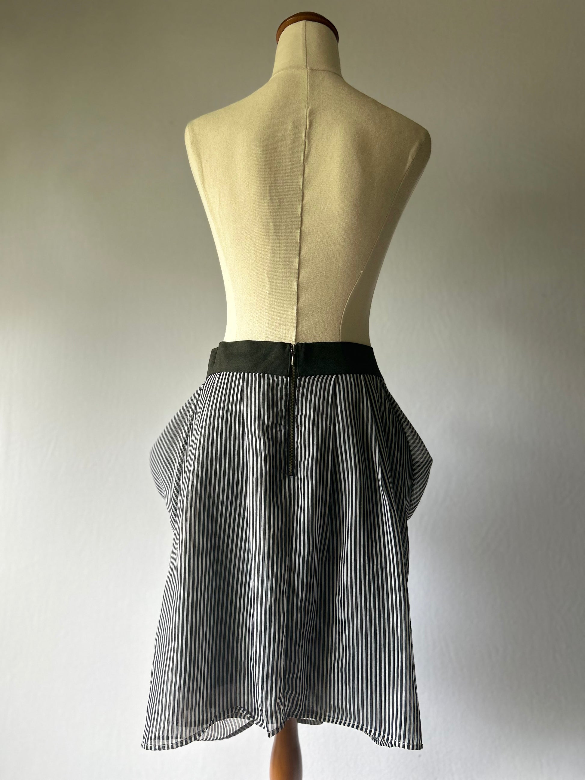 Make a bold statement with this black and white striped draped skirt. Designed in lightweight polyester, it features a structured waistband, asymmetric pleating, and a voluminous drape that adds movement and elegance. Perfect for pairing with a simple top and heels for a chic evening look, or styling casually with sneakers and a tee.