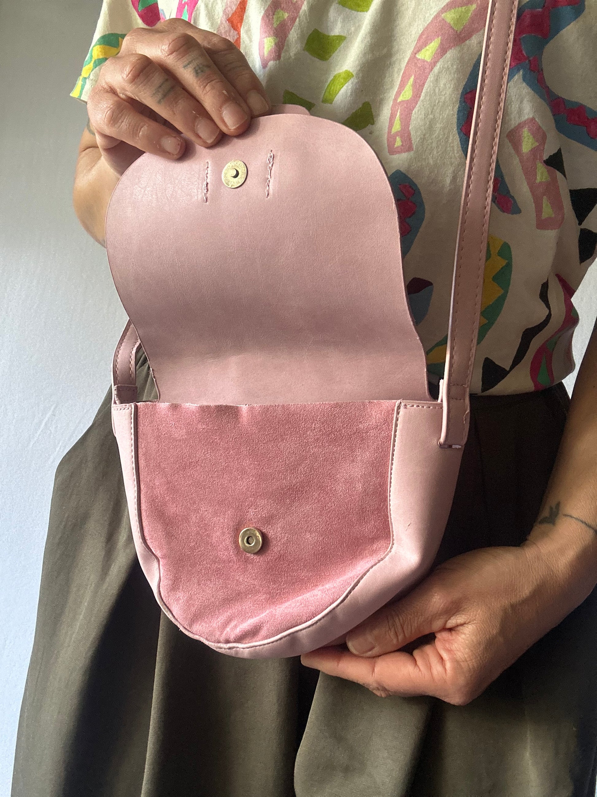 This beautiful blush pink crossbody bag brings a touch of soft elegance to your look. Made from smooth faux suede, it features a curved flap design and an adjustable strap for easy, comfortable wear. Spacious enough for your daily essentials, it’s the perfect blend of practicality and timeless charm.