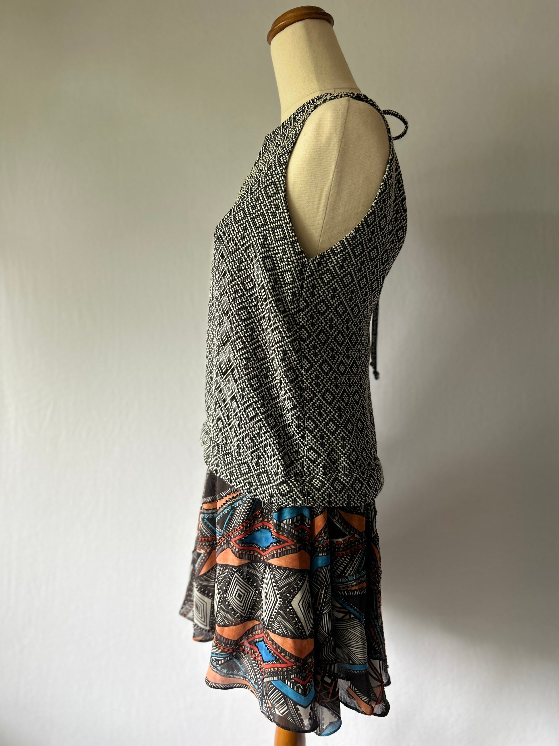 From the vibrant streets of Rio de Janeiro, this Cantão dress brings a playful mix of patterns and colors. Made from lightweight polyester, it features a sleeveless top with a geometric black-and-white print and a flowy skirt in bold abstract tones of coral, blue, and brown. A fun and artsy piece that reflects the effortless Brazilian spirit.