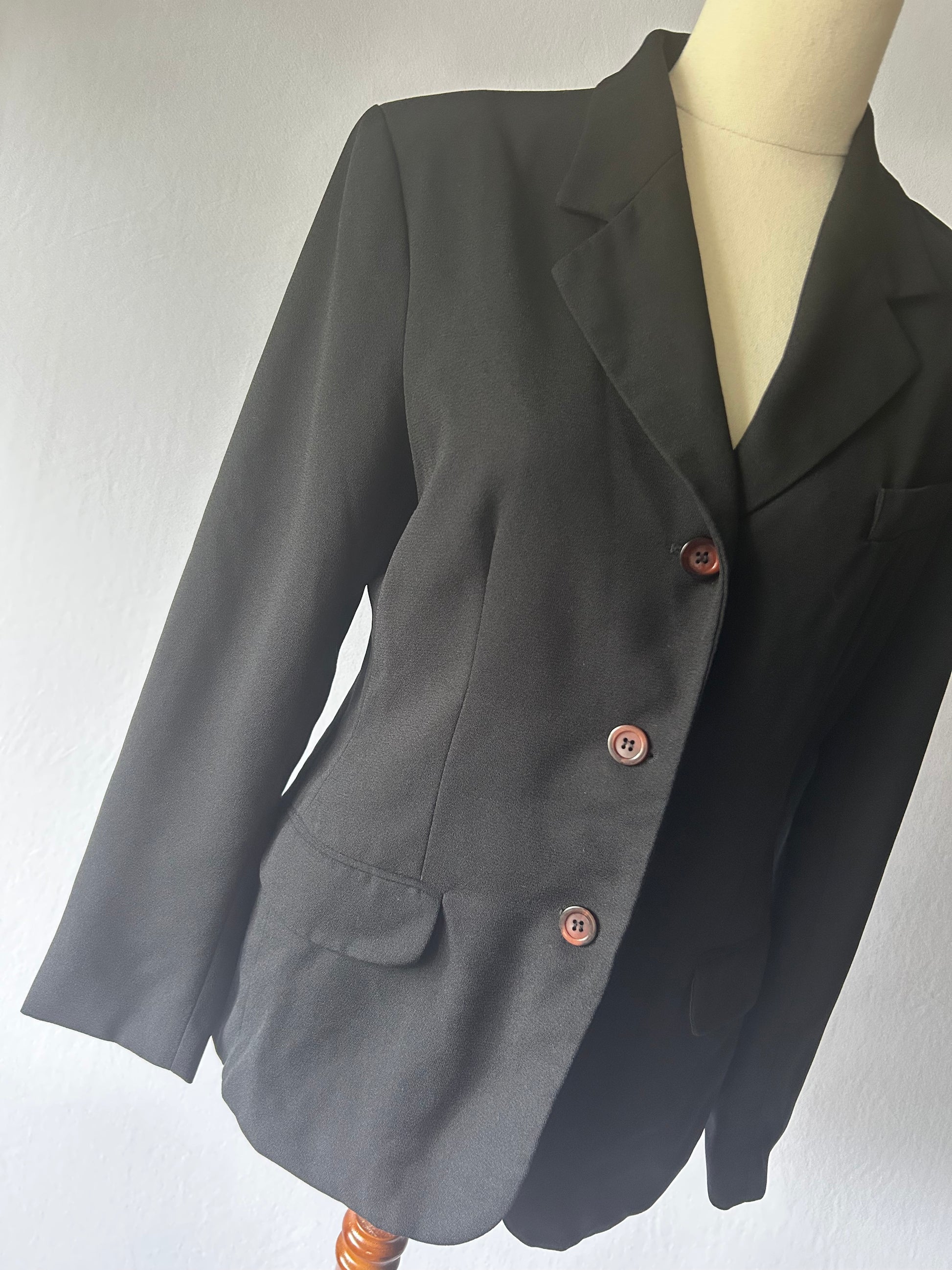 A wardrobe essential, this classic black blazer in size 10 is the perfect piece to elevate both professional and casual looks. Designed in lightweight polyester, it offers a sleek silhouette that layers effortlessly over blouses, dresses, or denim.