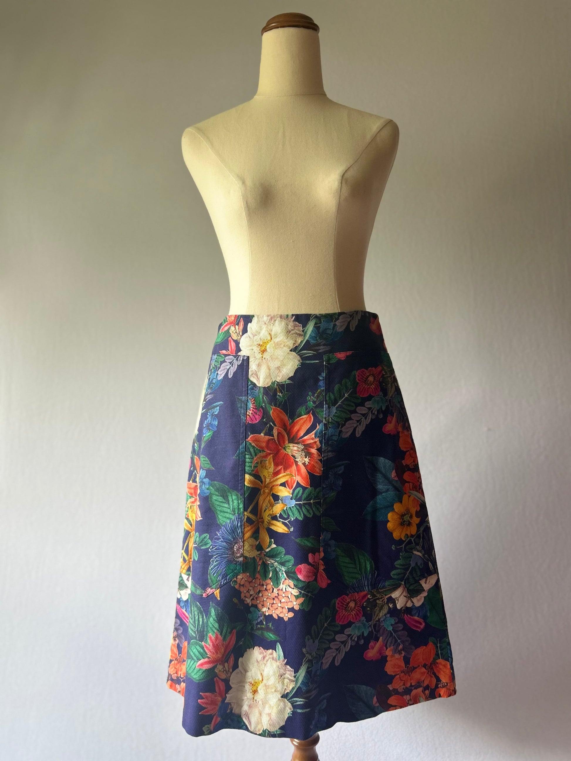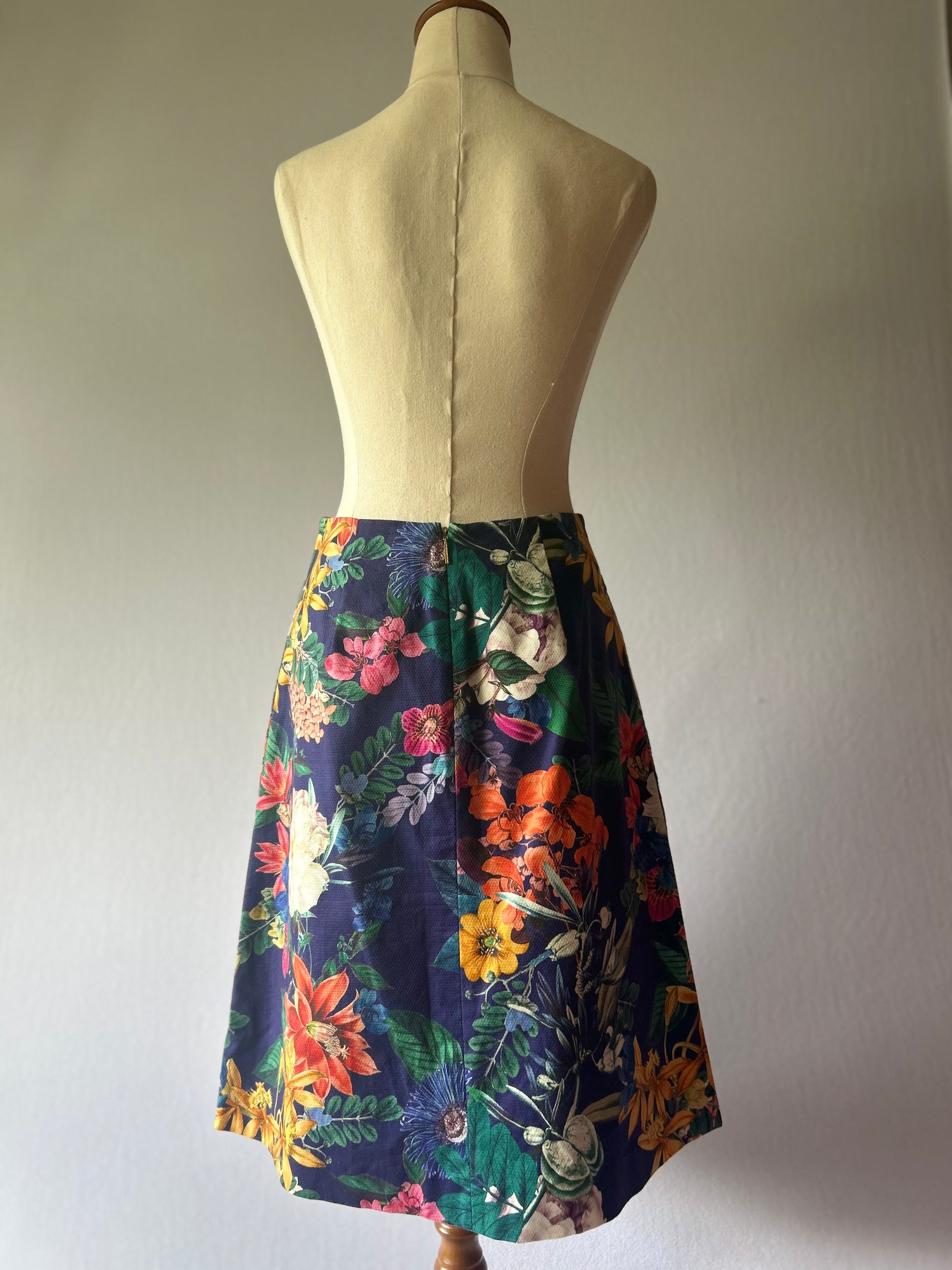Elevate your professional or weekend wardrobe with this stunning David Lawrence floral print skirt. This piece features a rich, dramatic botanical print with vibrant flowers—including orange lilies, soft creams, and rich reds—set against a deep navy or indigo background.