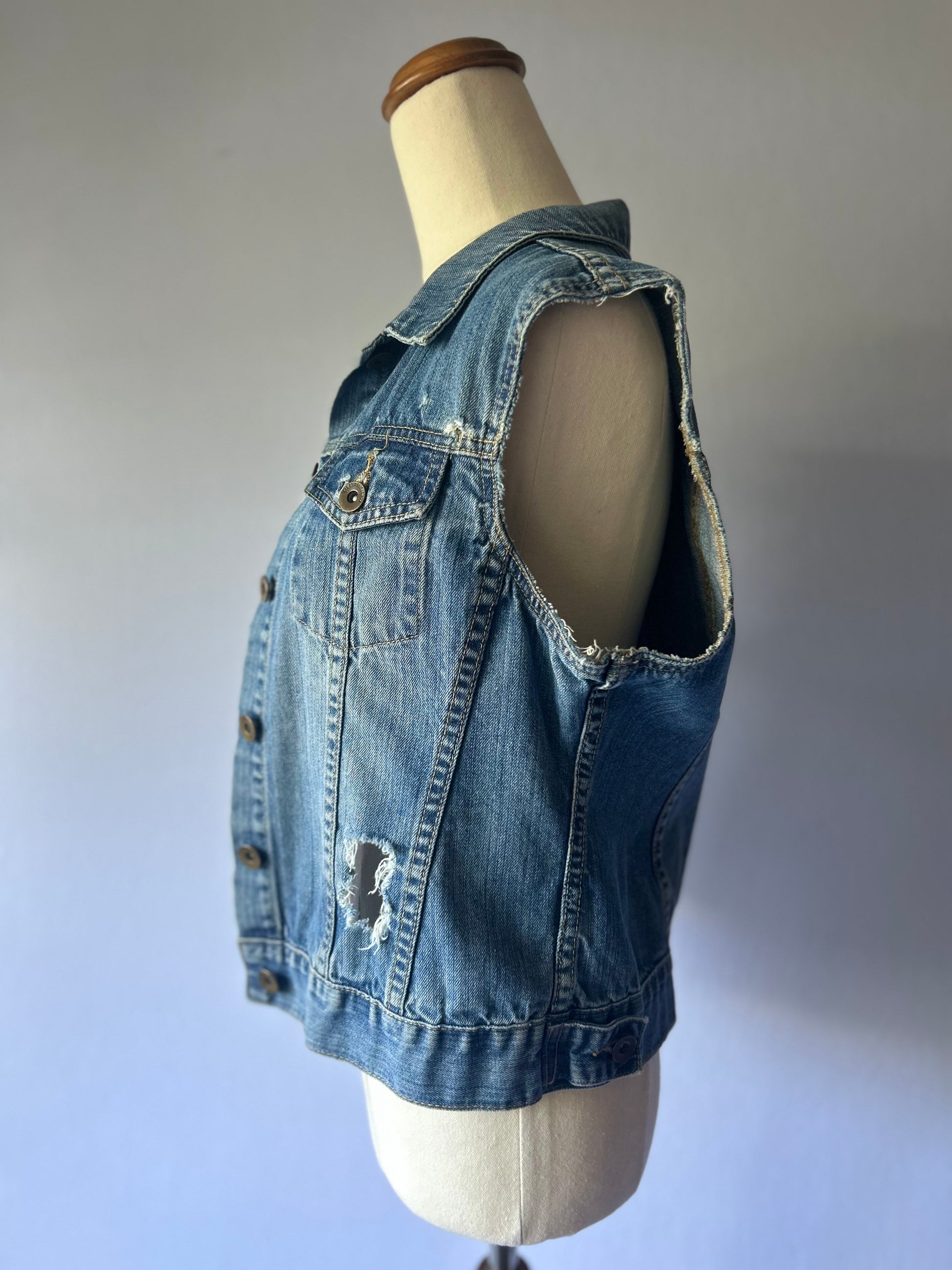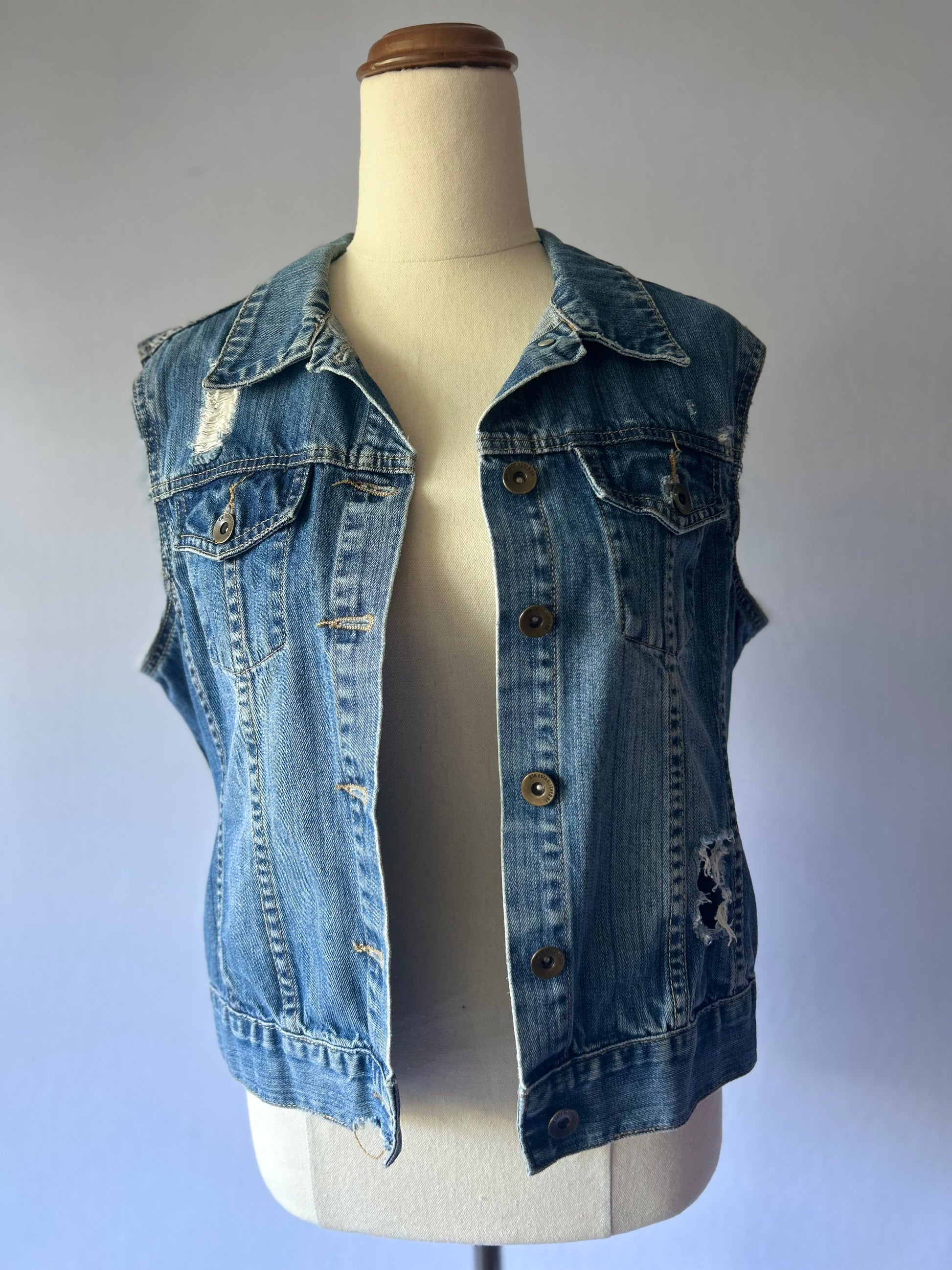 Add an edgy touch to your outfit with this pre-loved denim vest, size Small. Featuring stylish distressed details, it’s perfect for layering over tees, dresses, or casual tops. A versatile piece that blends classic denim with a modern, worn-in look.