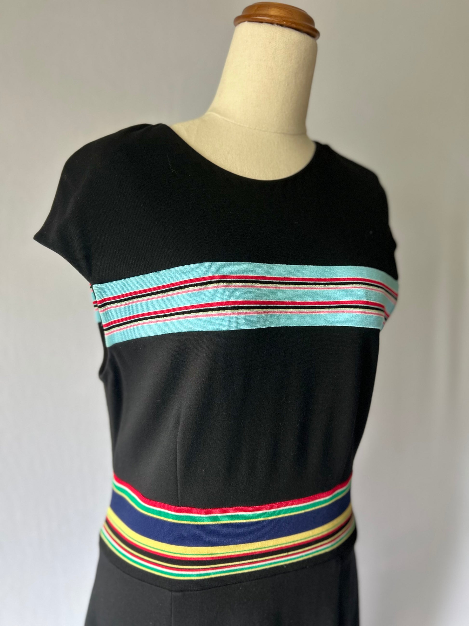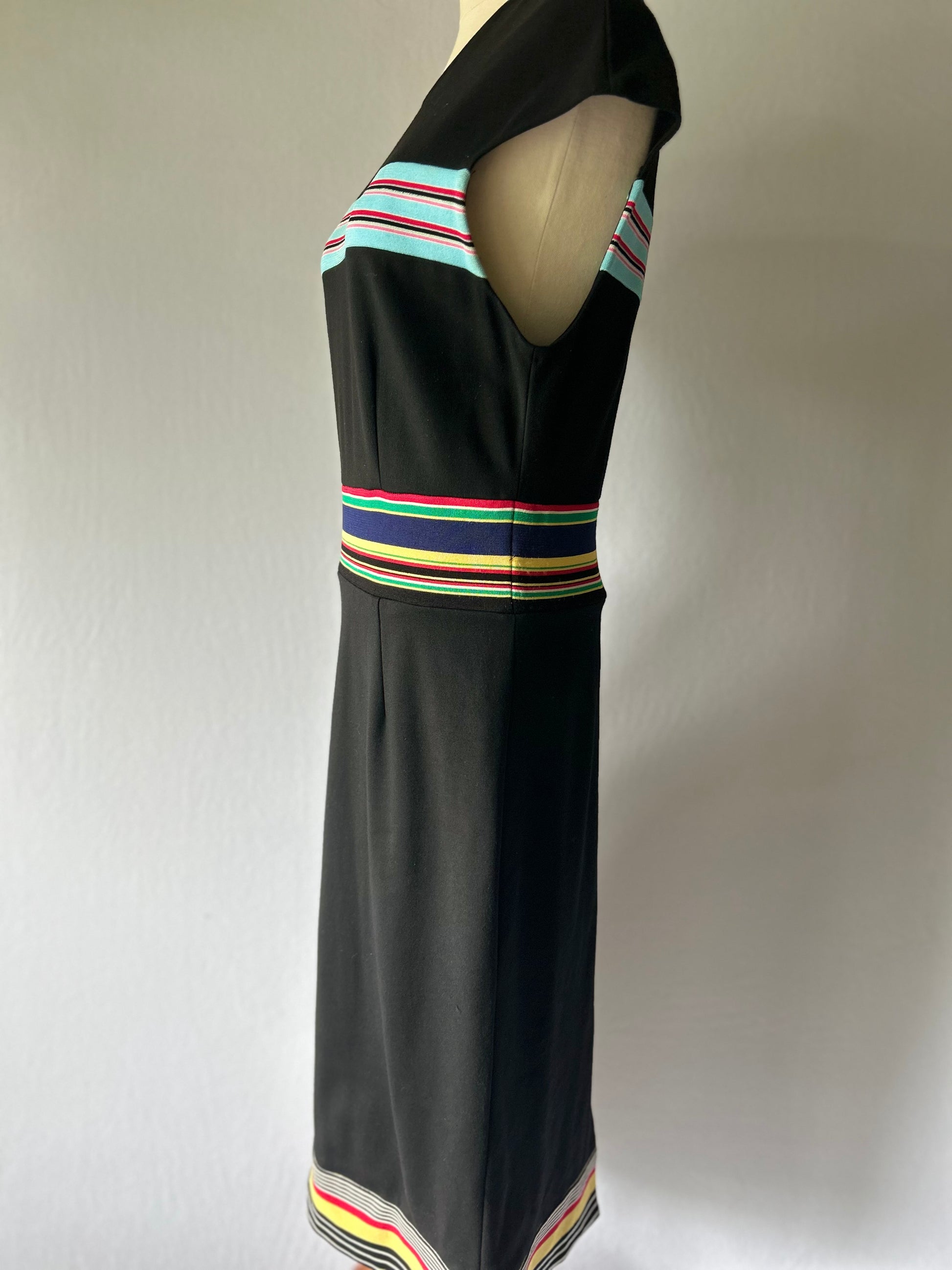 Make a statement with this Diane von Furstenberg designer dress, a timeless piece that combines elegance with a playful touch. Crafted in sleek black with multicolor stripe accents at the bodice, waist, and hemline, this dress offers a chic silhouette that’s perfect for both day and evening wear.