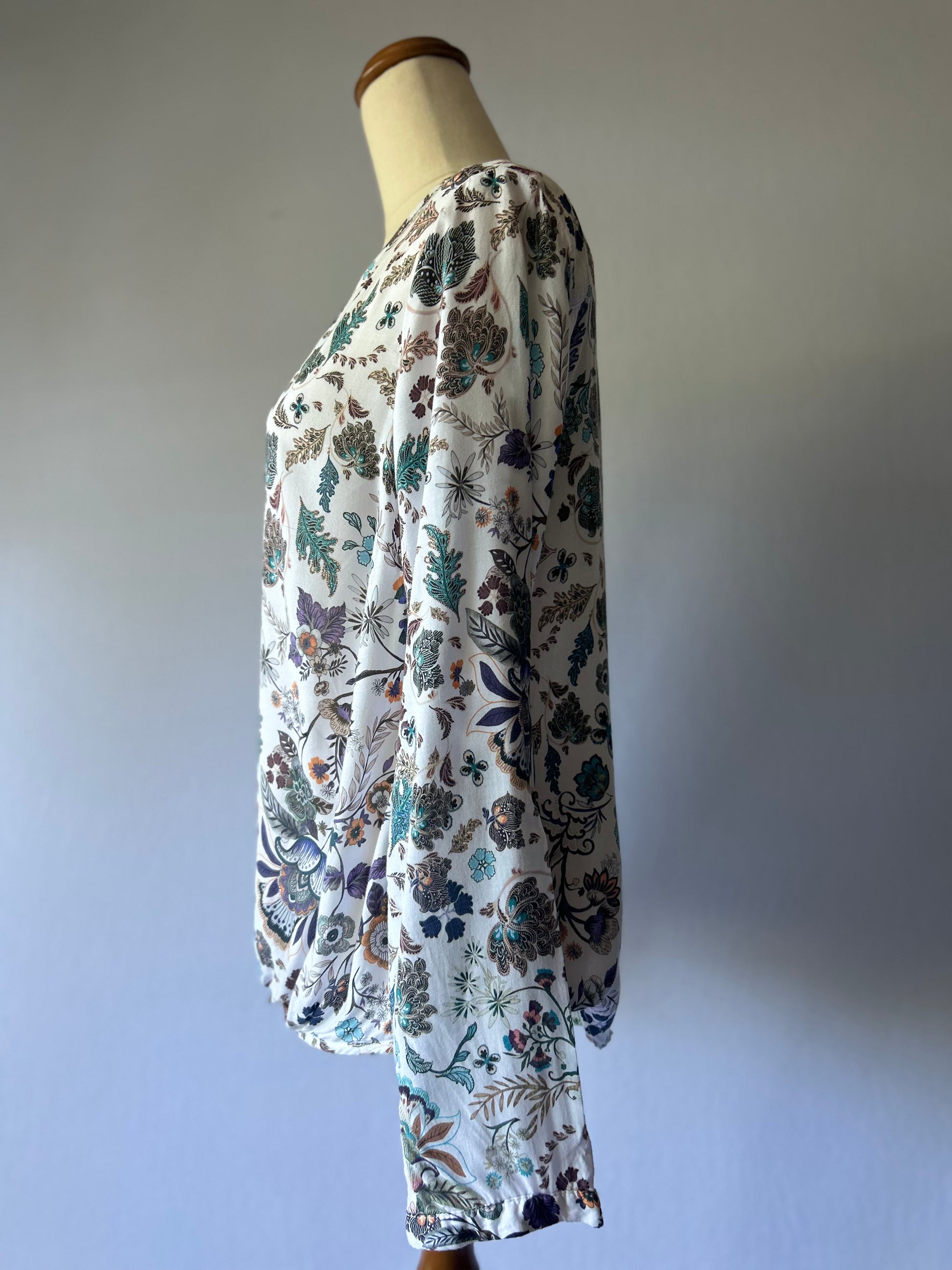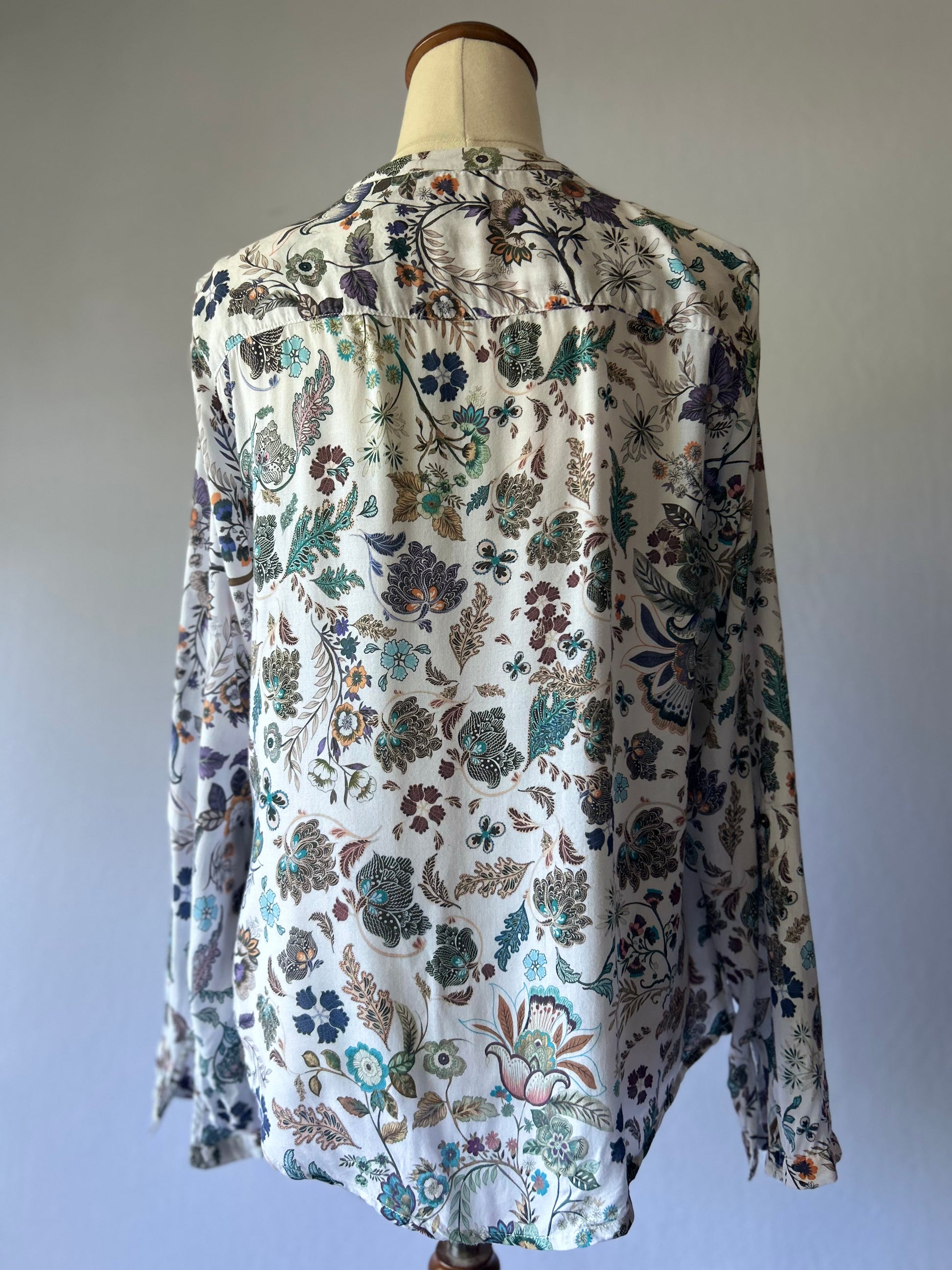 Soft and elegant, this floral long sleeve shirt is made from 100% viscose, offering a lightweight and flowy fit that drapes beautifully. The delicate floral print adds a feminine touch, making it perfect for both workdays and weekends.