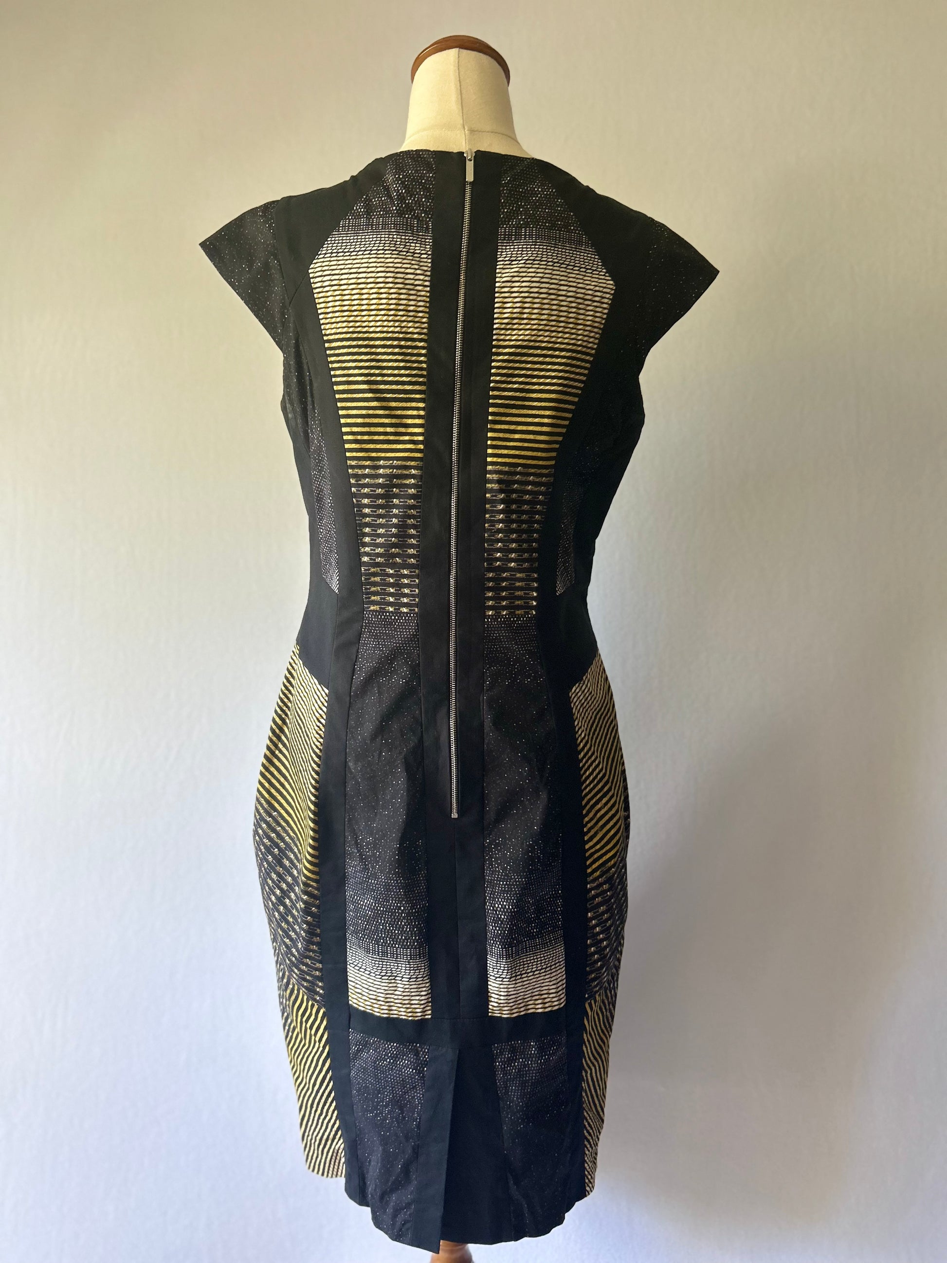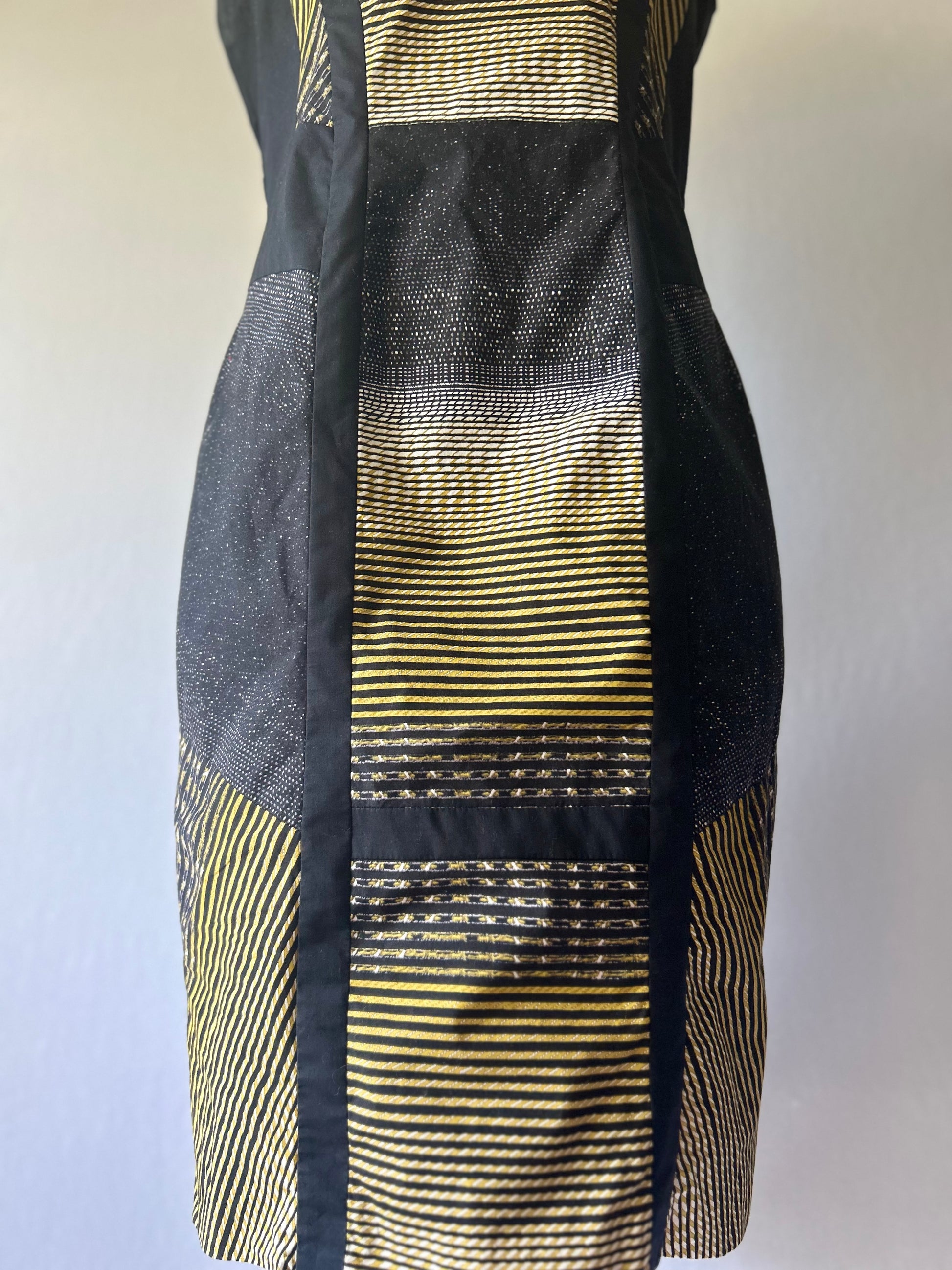 Make a bold entrance in this expertly tailored Sheath Dress, featuring a sophisticated, contemporary geometric pattern. The fabric combines matte black panels with striking metallic gold/yellow horizontal stripes that catch the light, adding a subtle sparkle. This structured dress is perfect for cocktail parties, business events, or formal occasions.