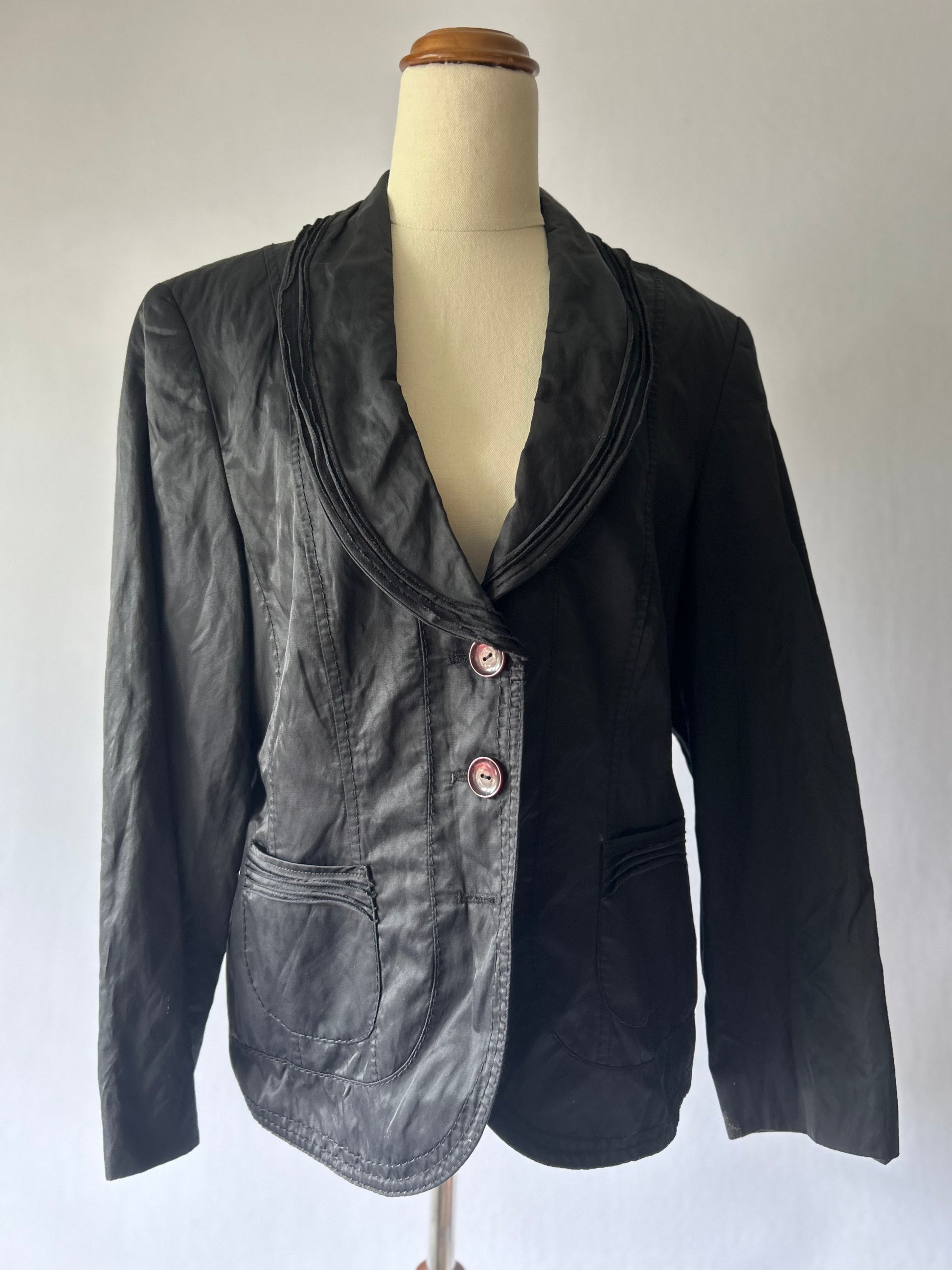 Elevate your wardrobe with this chic Gerry Weber black blazer, designed in size 38 / US 8. Crafted from a unique fabric blend of 49% cotton, 46% polyamide, and 5% metallic fibers, it offers a subtle sheen and modern edge. Fully lined in 100% acetate for comfort and structure, this blazer is a versatile piece that transitions seamlessly from day to night.