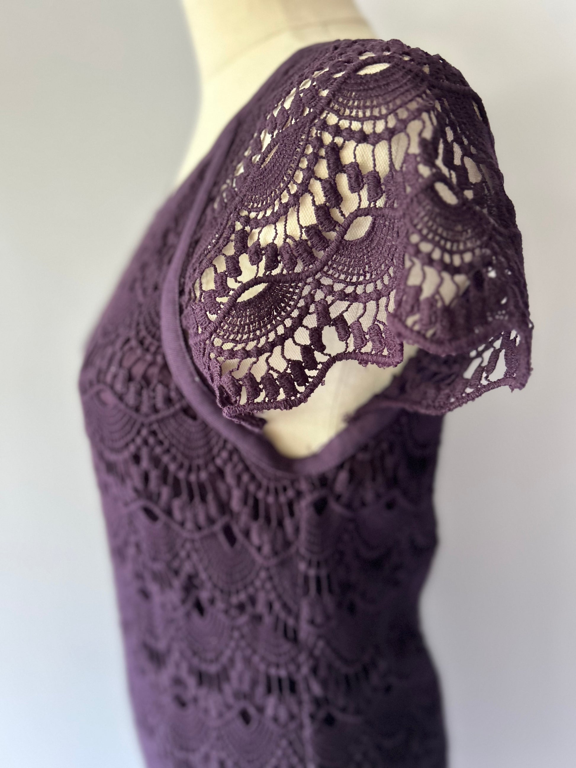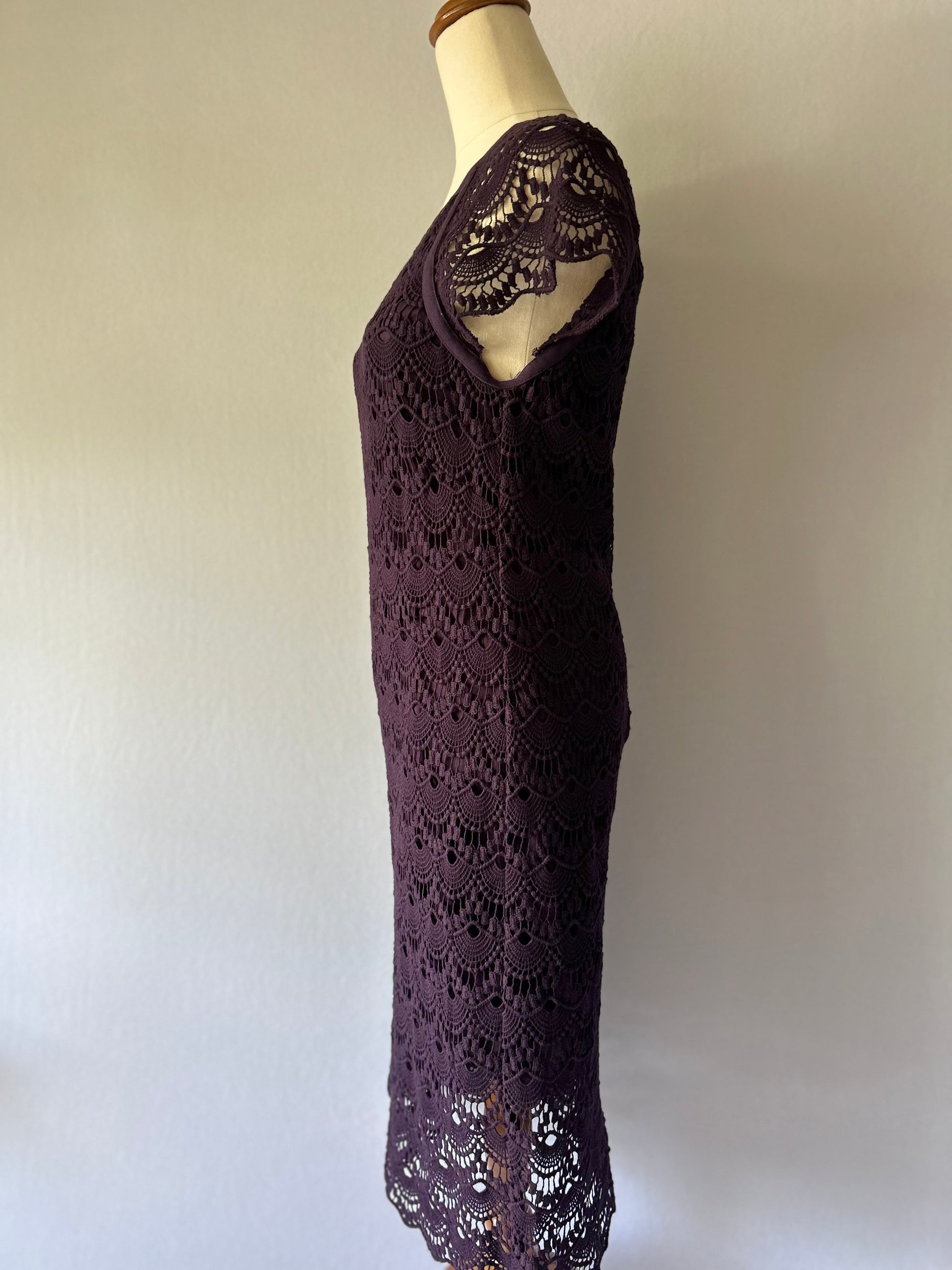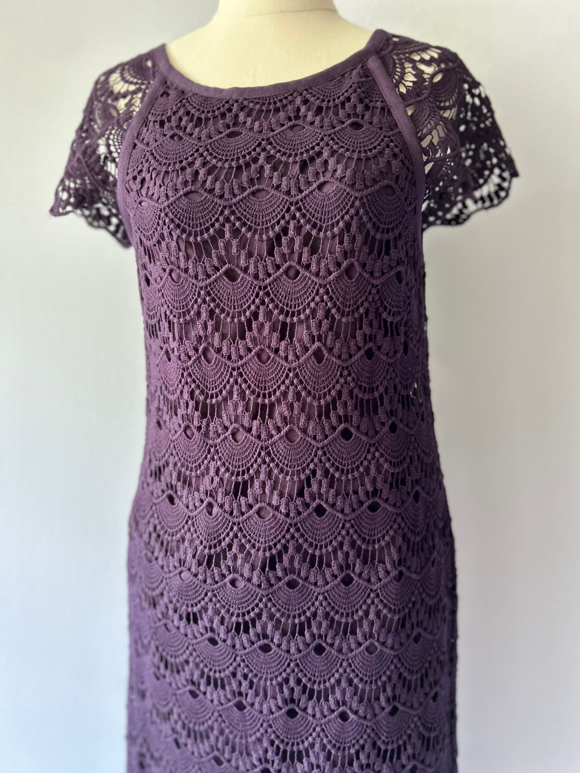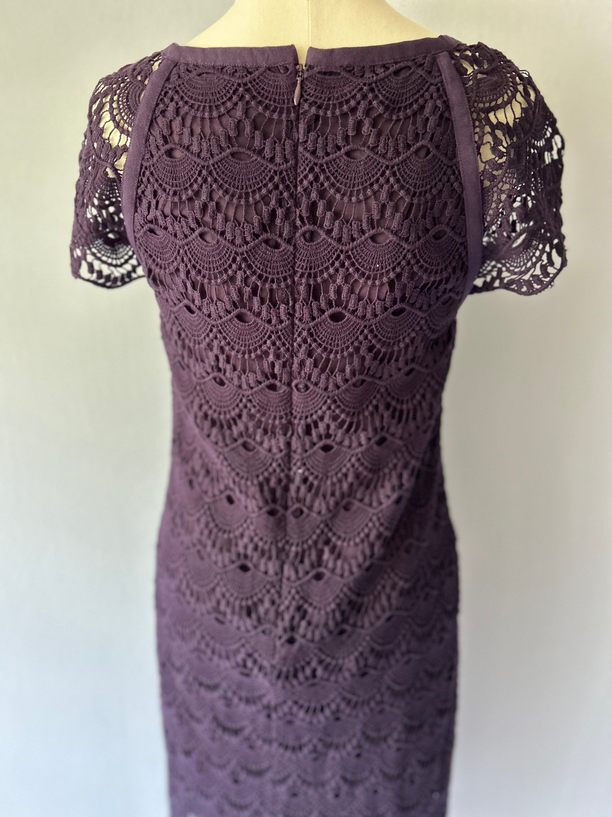 This elegant Grace Hill dress is tagged as a size 10 and features a sophisticated deep burgundy/plum colour. The entire shell is covered in a beautiful scalloped, open-weave lace pattern, giving it a classic and refined texture. It has a flattering sheath silhouette, gentle cap sleeves, and a modest round neckline. Being made from 100% Cotton (both shell and lining), this dress is comfortable and breathable. It is fully lined, making it ready for any special occasion, cocktail party,