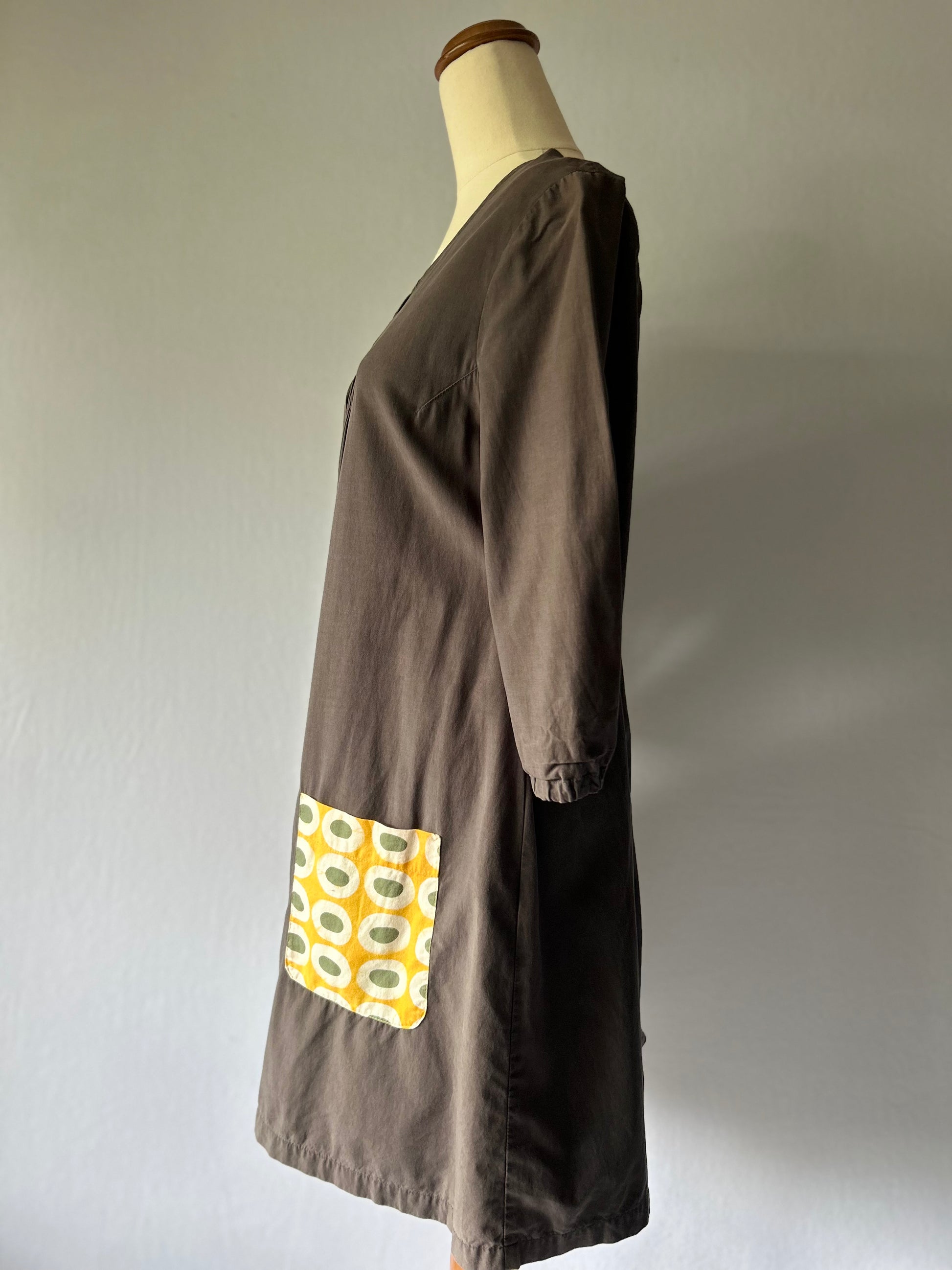 This grey cotton dress offers effortless comfort with a playful touch. Designed in a relaxed fit, it features soft pleats at the neckline and two standout front pockets in a retro-inspired yellow and olive circle print. The breathable cotton fabric makes it perfect for all-day wear, while the 3/4 sleeves add versatility for year-round styling.