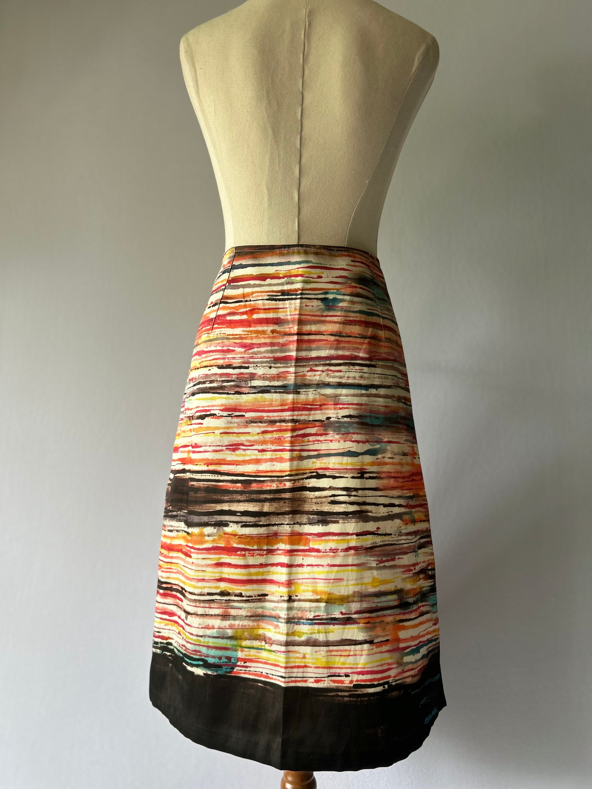 Make a vibrant and artistic statement with this gorgeous Jane Daniel’s Skirt. Featuring a stunning abstract print resembling a multi-colored sunset or horizon, this pencil skirt is a unique piece designed and Made in New Zealand. The structured fabric holds its tailored shape perfectly, making it ideal for the office or a gallery opening.