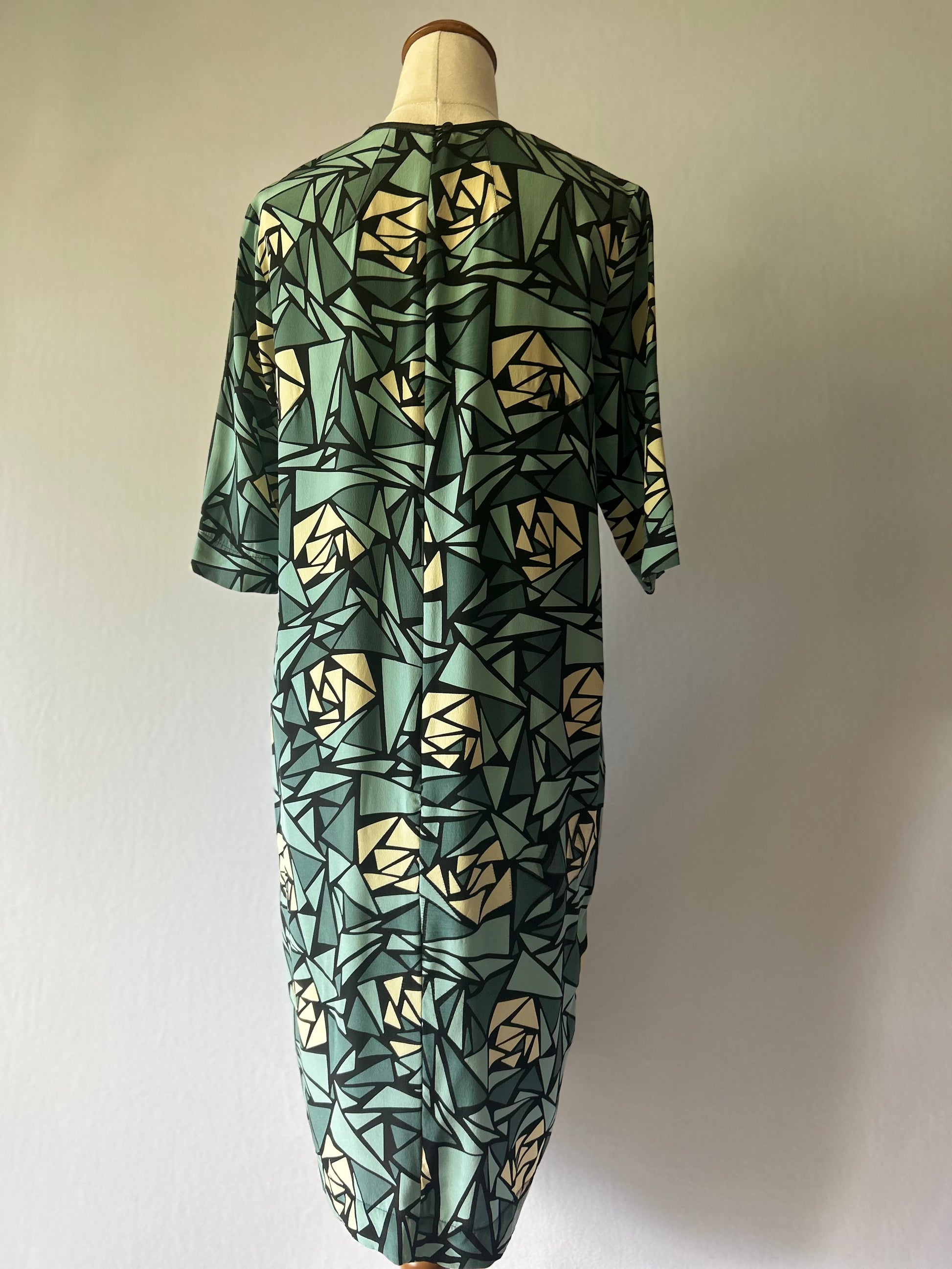 This stunning Juliette Hogan dress is a true statement piece. Crafted in New Zealand from luxurious silk, it features a modern geometric print in rich green and soft beige tones. The relaxed silhouette and mid-length sleeves create an effortless, elegant fit perfect for day-to-night styling.