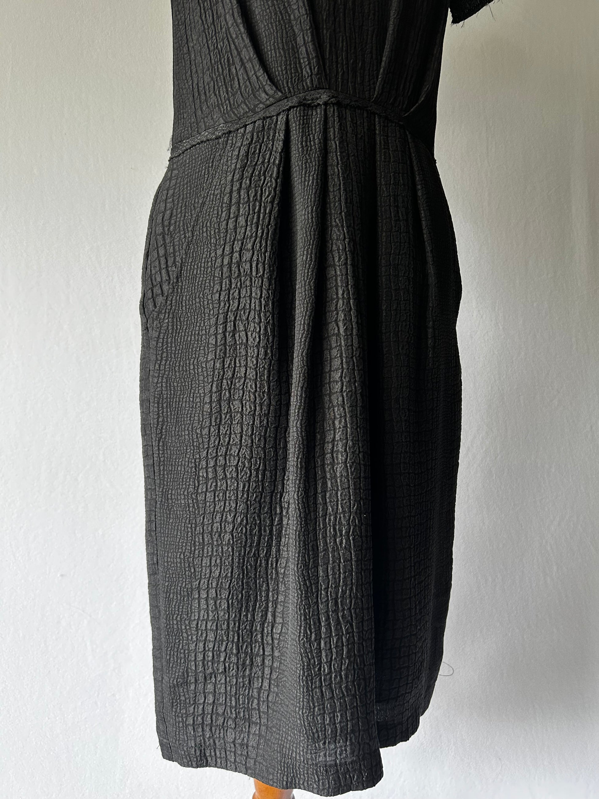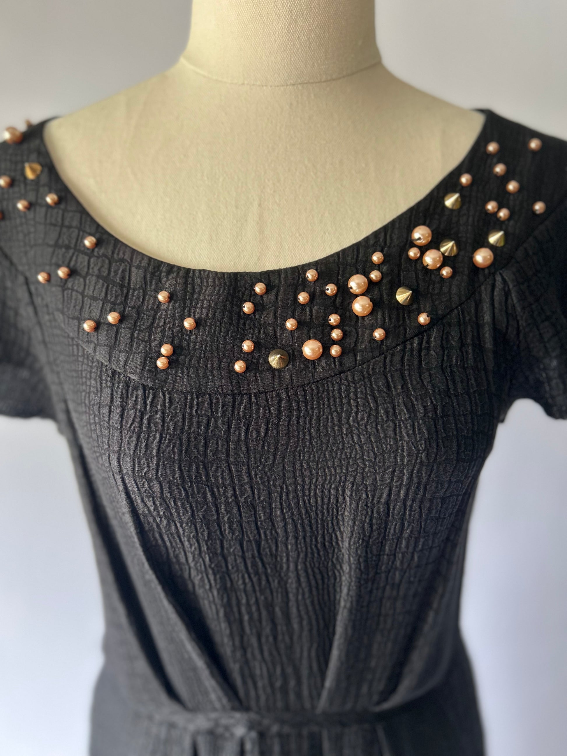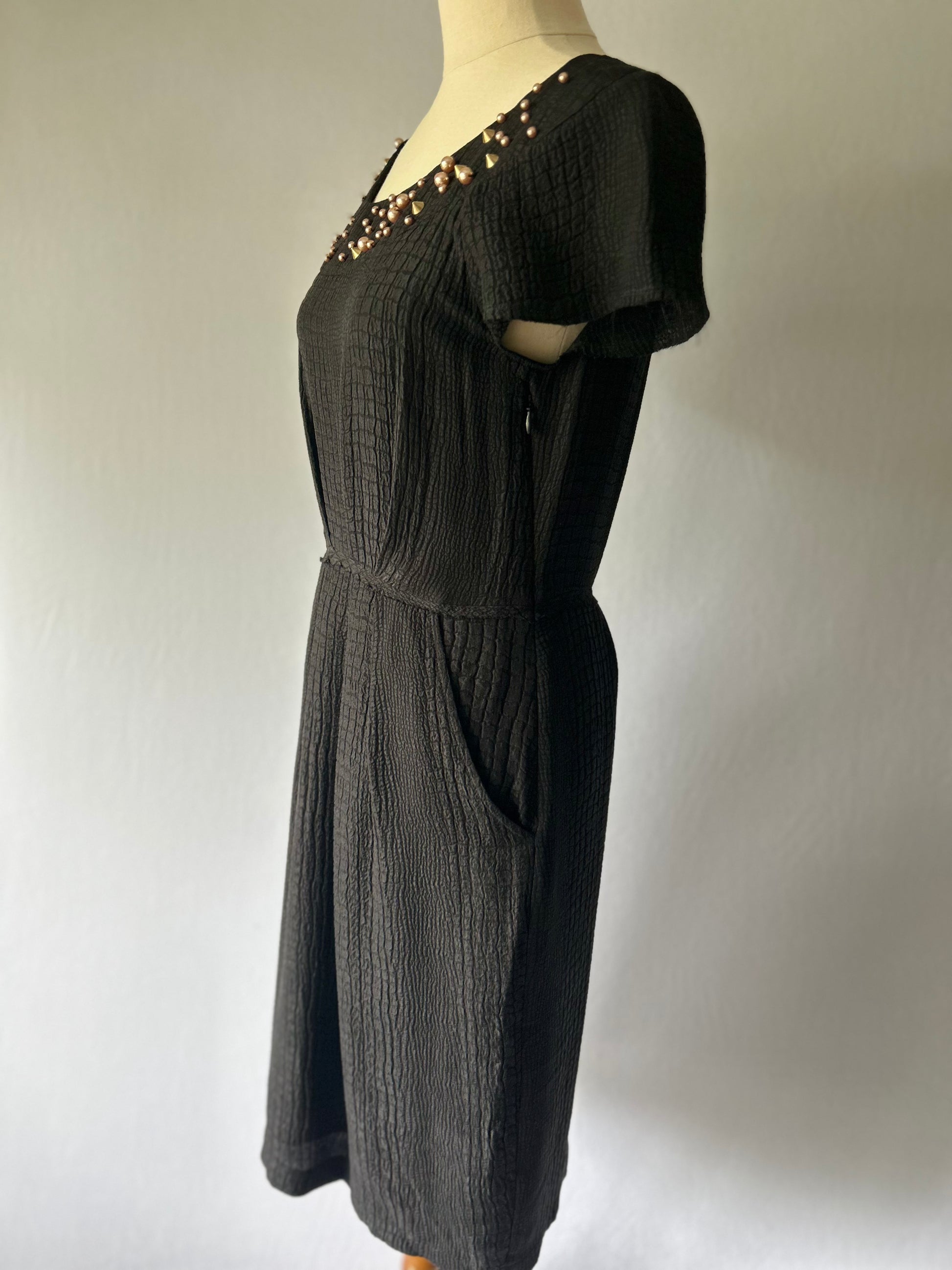 Elevate your wardrobe with this timeless Kate Sylvester black silk dress, crafted in 100% silk for a luxurious feel and elegant drape. Featuring a flattering waist tie, short sleeves, and exquisite pearl embellishments along the neckline, this dress seamlessly blends sophistication with subtle statement details.