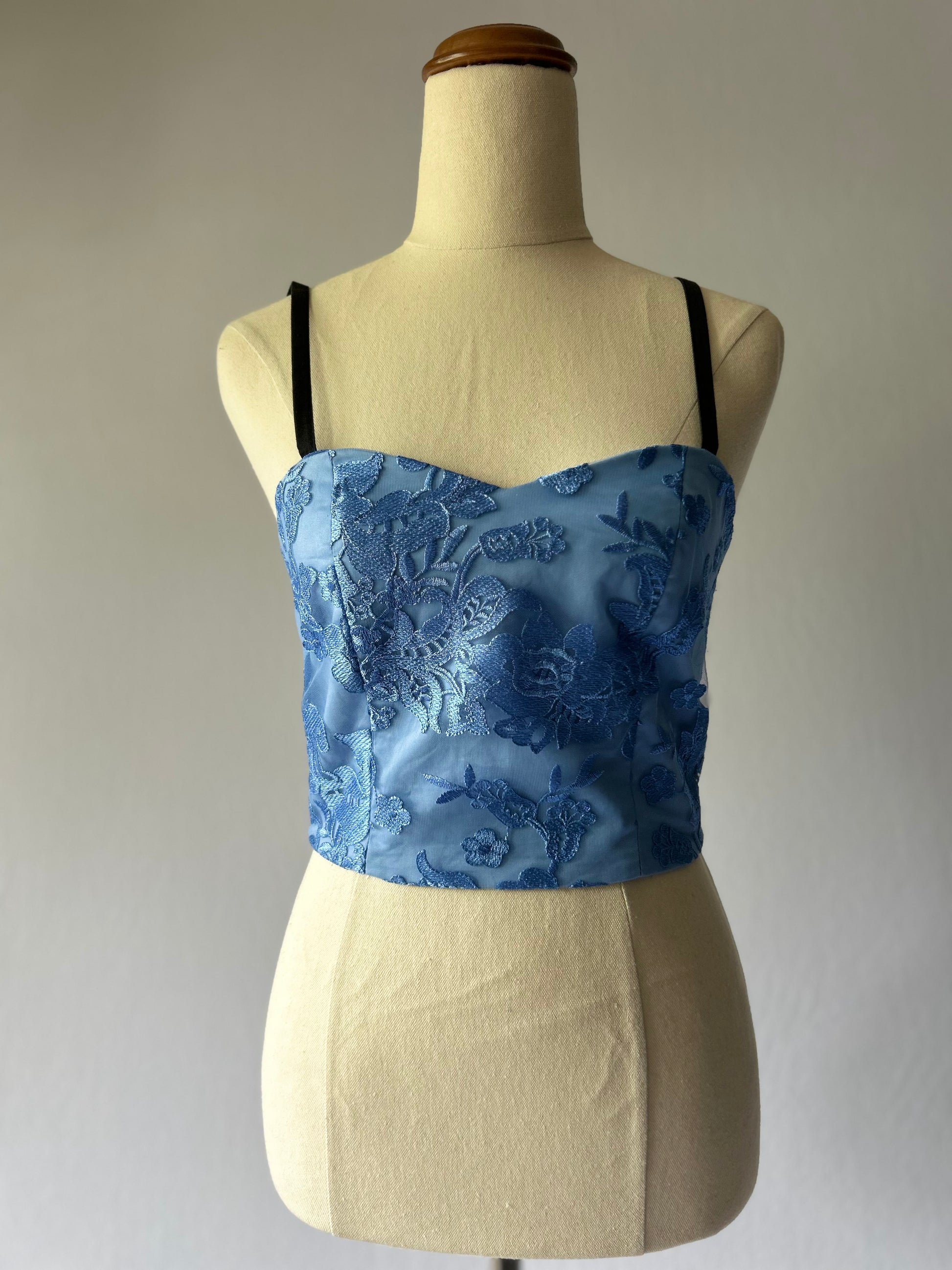 Delicate lace embroidered blue top featuring intricate floral detailing and a timeless feminine silhouette. Crafted with care, this elegant piece adds a touch of sophistication to any outfit — perfect for both casual chic looks and special occasions.