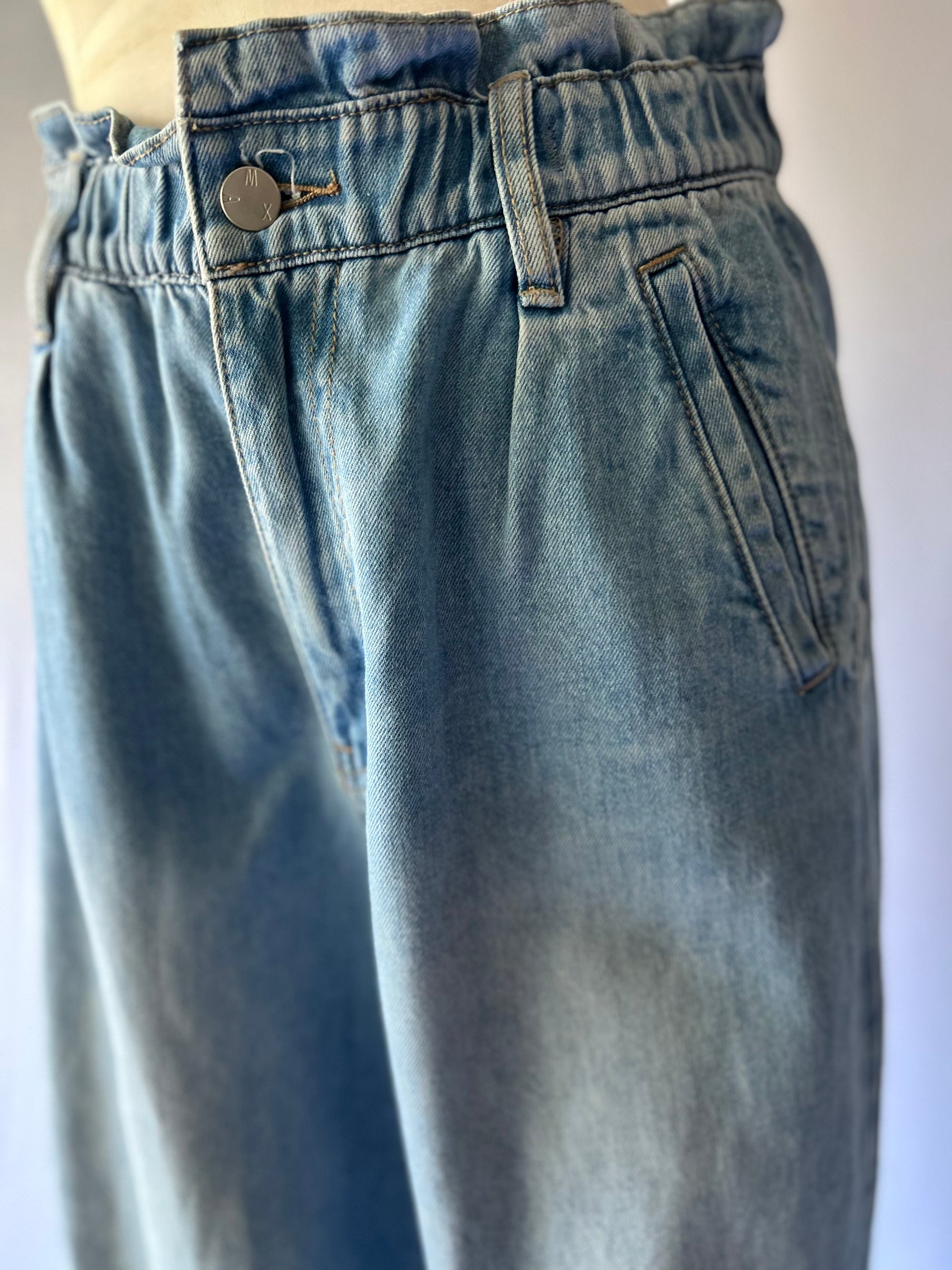 Elevate your everyday wardrobe with these Max high-waist relaxed denim pants in size 12. Crafted from quality cotton denim, this pair features a comfortable elasticated paperbag-style waistband, tapered leg, and classic light blue wash for a timeless look. Easy to style up or down, these versatile jeans are a perfect blend of comfort and effortless style.