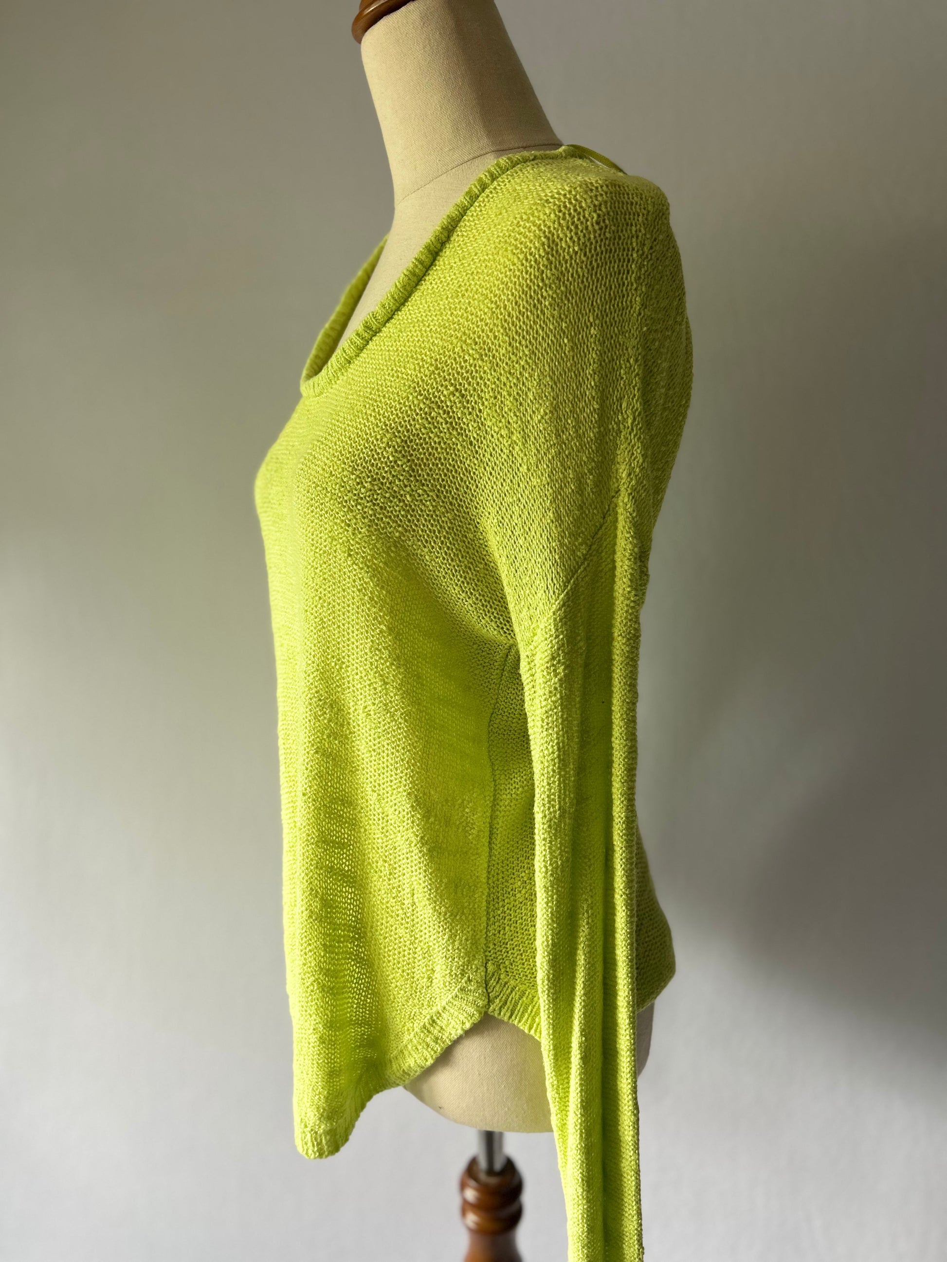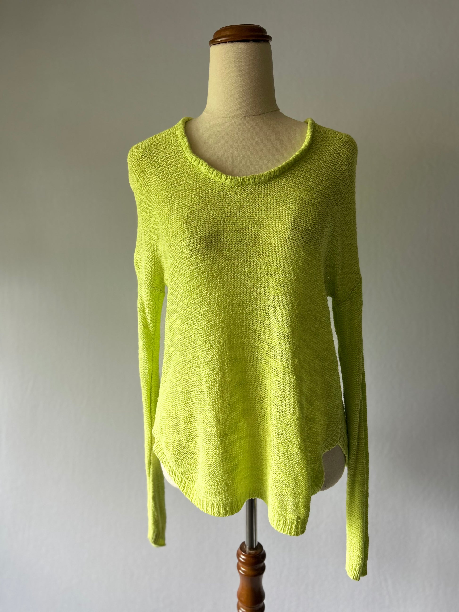 This bright, eye-catching knit top is tagged as a size Small. It features a vibrant Neon Yellow/Lime Green hue, guaranteed to make a statement. The top has a lightweight, slouchy fit with long sleeves, a soft scoop V-neckline, and an uneven high-low hem with subtle side slits. The loose, open-weave knit texture is perfect for breathable comfort. Made from a soft Cotton blend, this piece is ideal for adding a pop of colour to your casual wear, or for layering on cooler days.