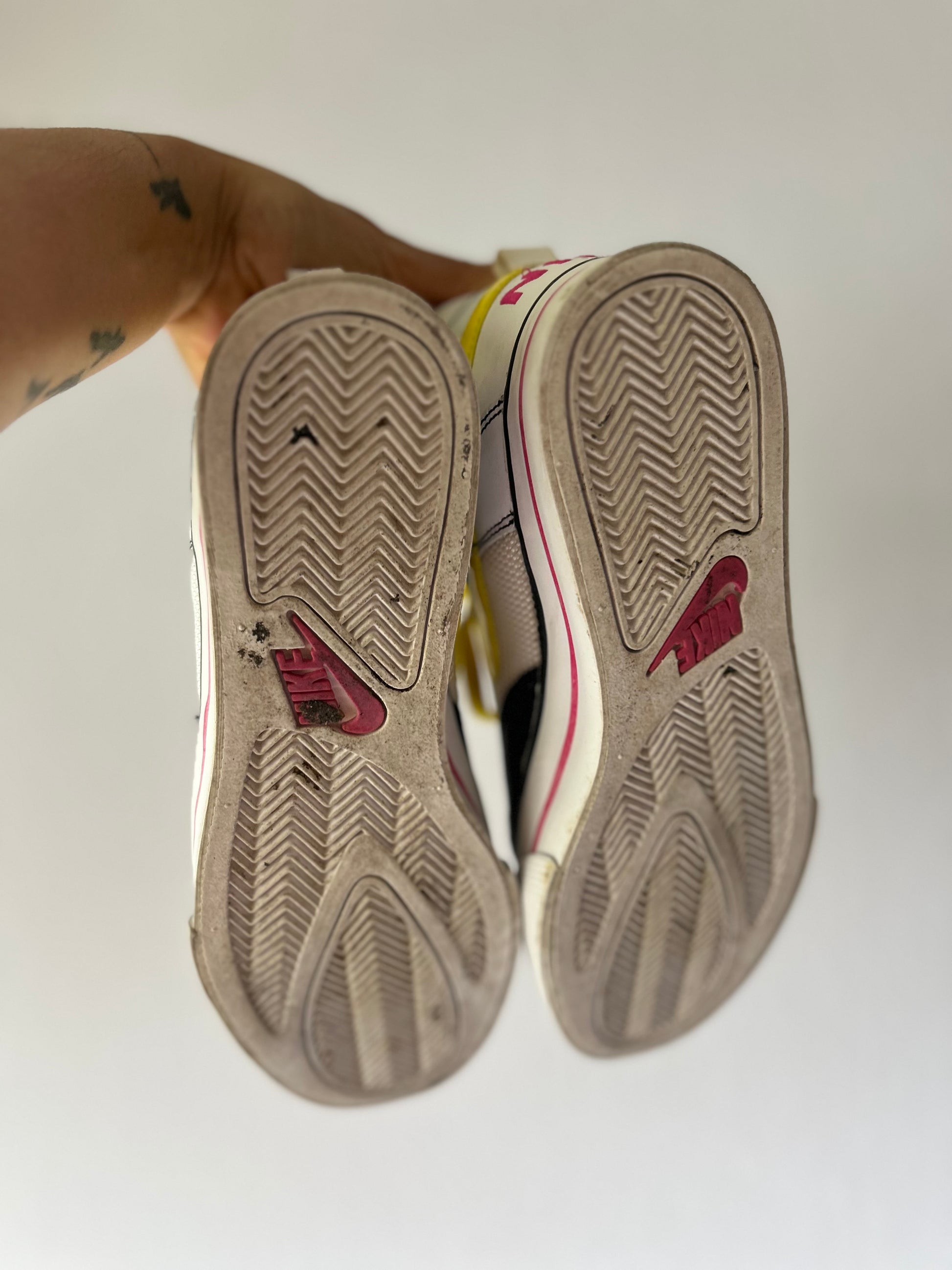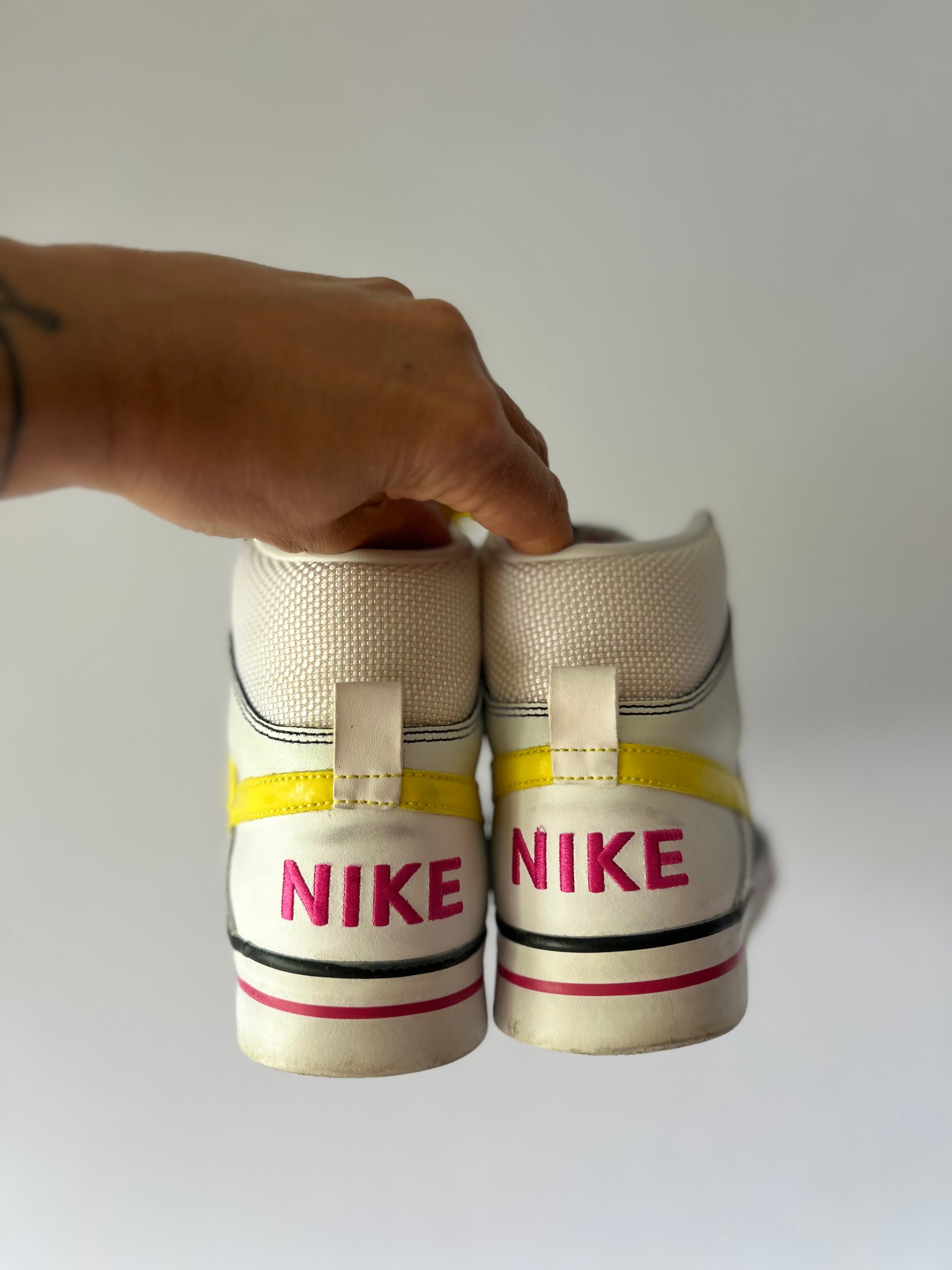 Make a bold, sophisticated statement with these striking Nike high-top sneakers. Featuring a classic silhouette updated with a dynamic color palette of white/cream, black overlays, and vibrant neon yellow and magenta accents, these shoes are a perfect blend of retro style and contemporary flair. The durable construction and supportive high-top design ensure comfort and confident style whether you're hitting the streets or elevating your casual weekend look. A truly unique piece for the sneaker enthusiast.