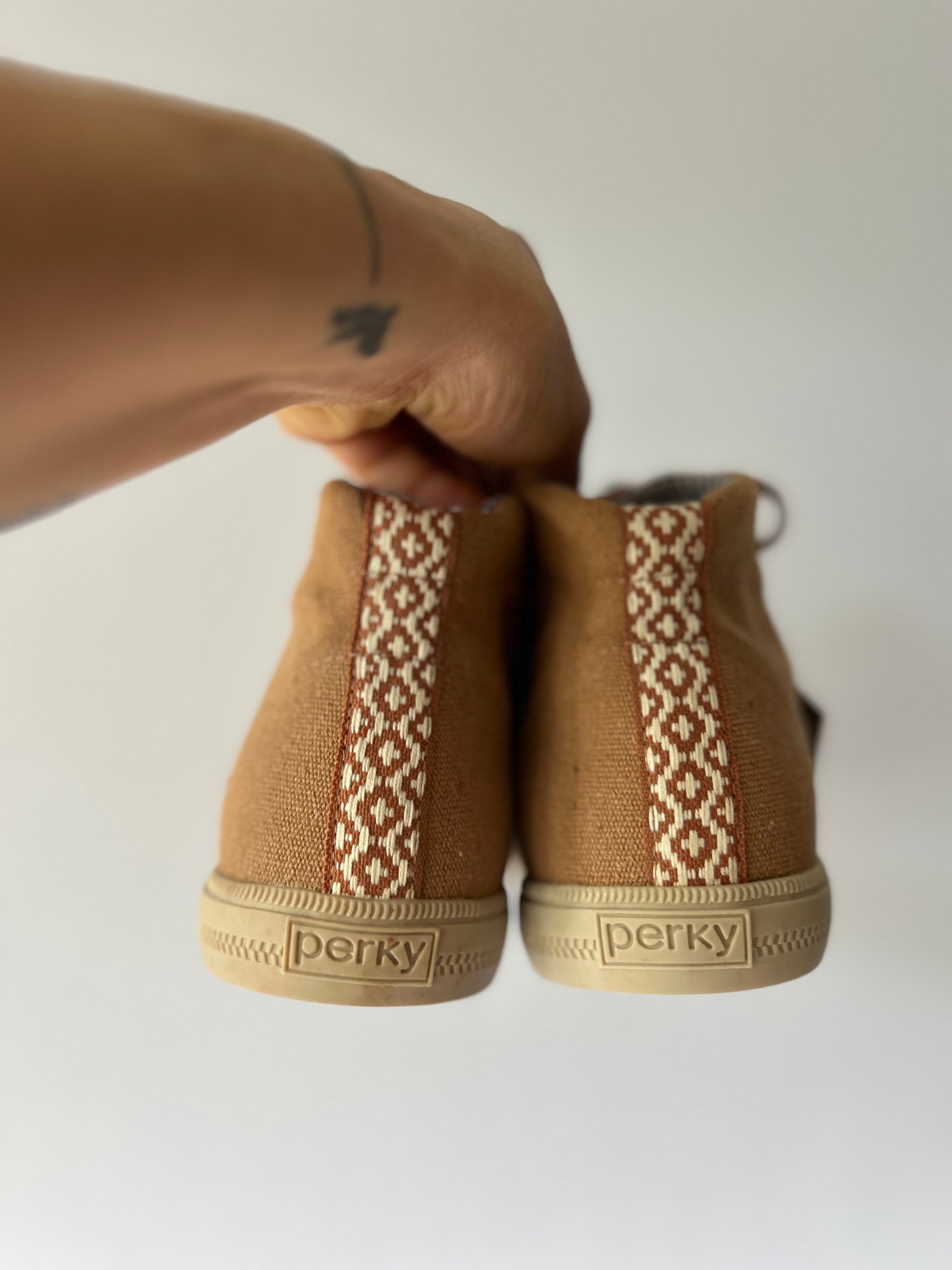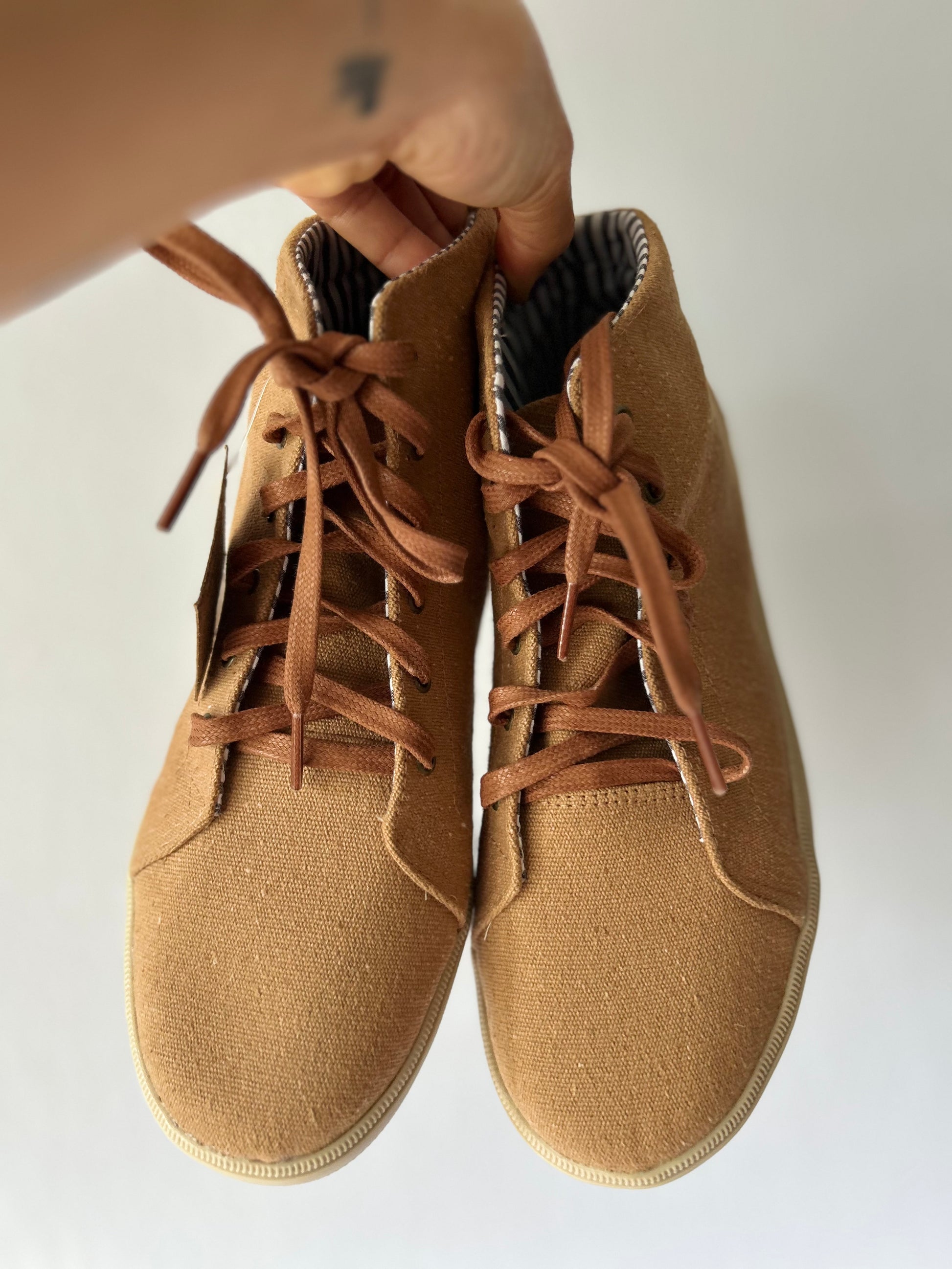 Step into comfort and conscious style with these Perky high-top sneakers, made in Brazil. Crafted from natural-colored canvas with eco-friendly materials, these sneakers are perfect for everyday wear. Their minimalist design and neutral tone make them easy to pair with any outfit, from casual jeans to flowy dresses.