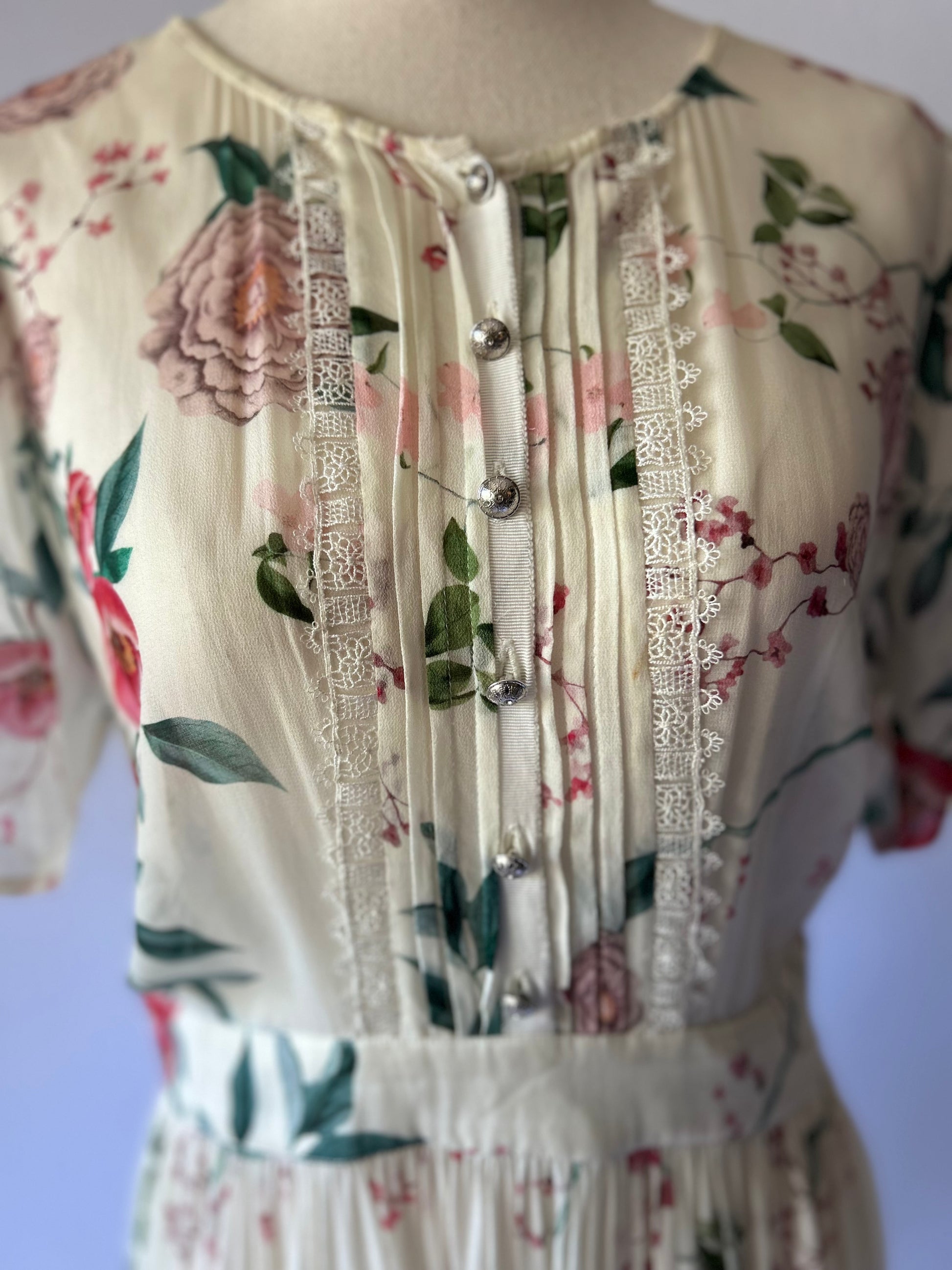 Capture timeless charm with this exquisite silk dress, featuring a delicate floral print that evokes a beautiful vintage aesthetic. This flowing, feminine piece is perfect for garden parties, weddings, or elegant daytime events.