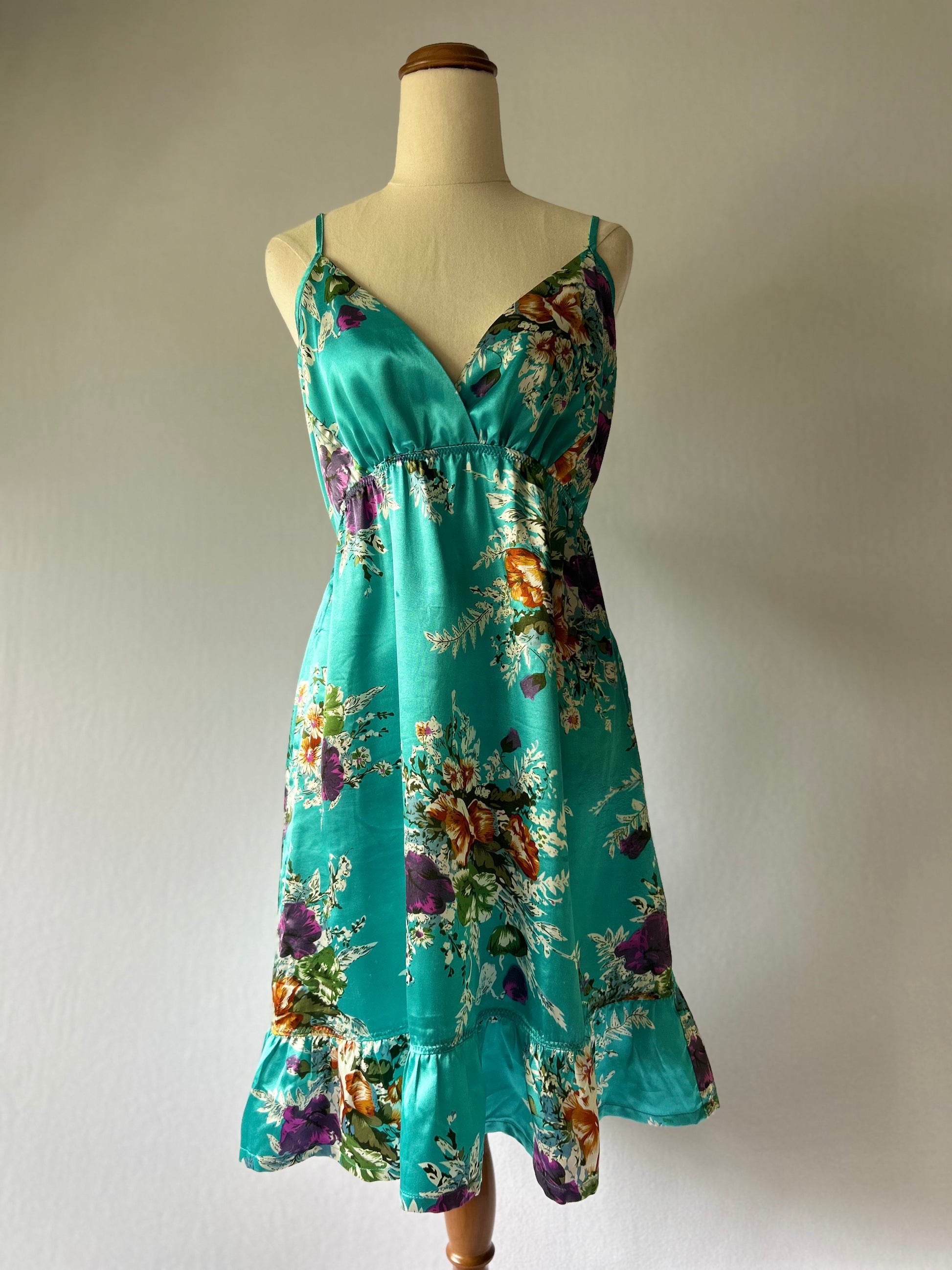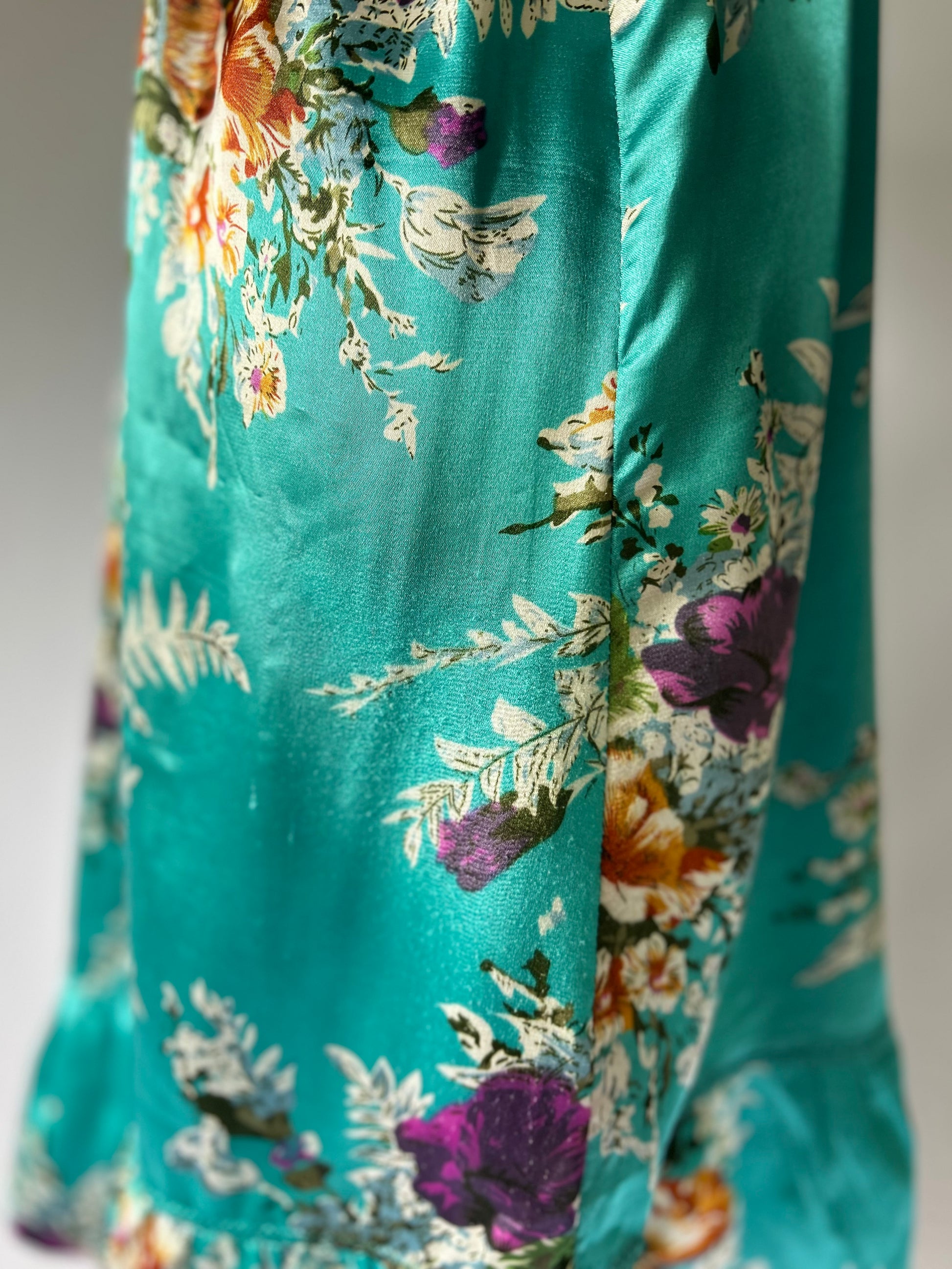 Float through summer in this beautiful Floral Print Dress featuring a vibrant print on a luxurious, silky-finish polyester fabric. The eye-catching aqua blue background is adorned with rich floral motifs in shades of purple, orange, and green. Its flattering design makes it perfect for warm weather parties or resort wear.