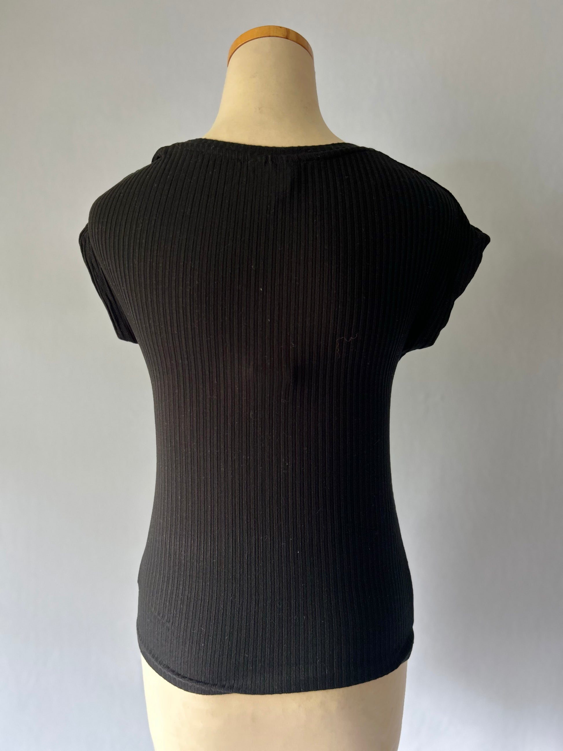This essential and flattering Seed top is tagged as a size Small. It features a classic black ribbed texture and a unique twist or knot detail at the center of the V-neckline, creating a lovely draped effect across the bust. The capped sleeves and fitted silhouette make it a perfect layering piece or a stylish stand-alone top. Crafted from a comfortable and flexible blend of 94% Viscose and 6% Elastane, it offers excellent stretch and drape, making it ideal for everyday wear or a dressed-up casual look.