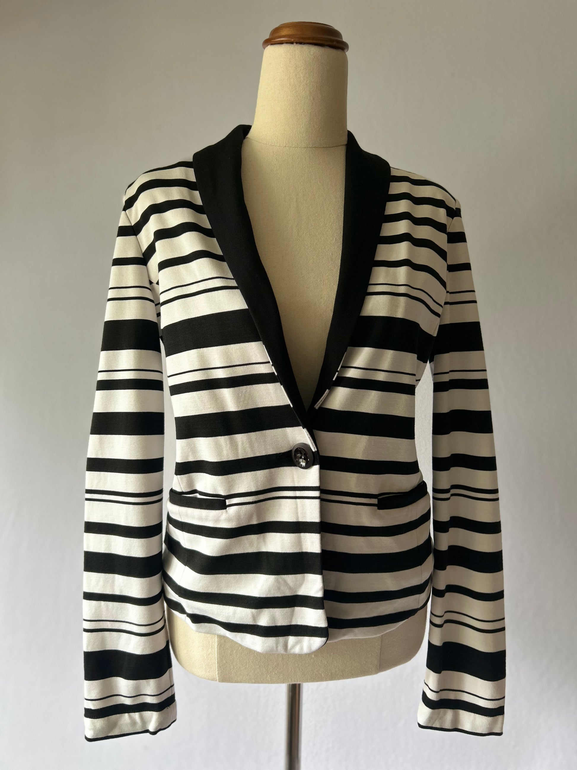 Elevate your wardrobe with this chic black and white striped blazer. Designed in a classic cut with a modern twist, it features a sleek contrast lapel, single-button closure, and front welt pockets. Made from a comfortable blend of 54% viscose, 41% polyester, and 5% elastane, this blazer offers the perfect balance of structure and stretch for everyday wear.