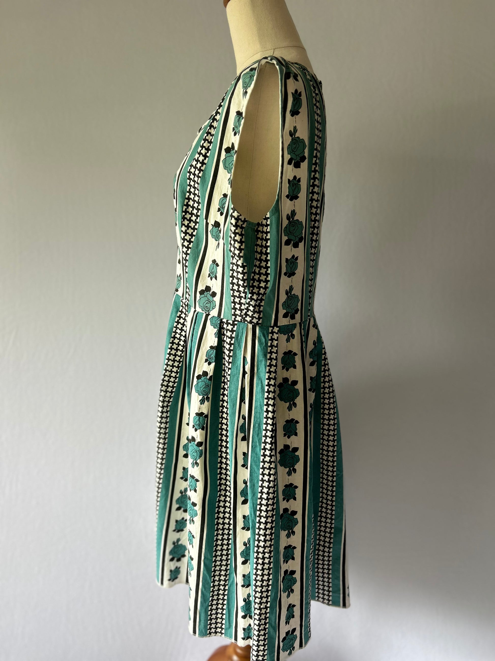 Playful and fresh, this 100% cotton dress features a charming floral and stripe pattern in green and cream tones. With a relaxed fit and sleeveless design, it’s perfect for warm days or for layering with a light jacket. The gathered waist adds movement and comfort, creating an easy, feminine silhouette.