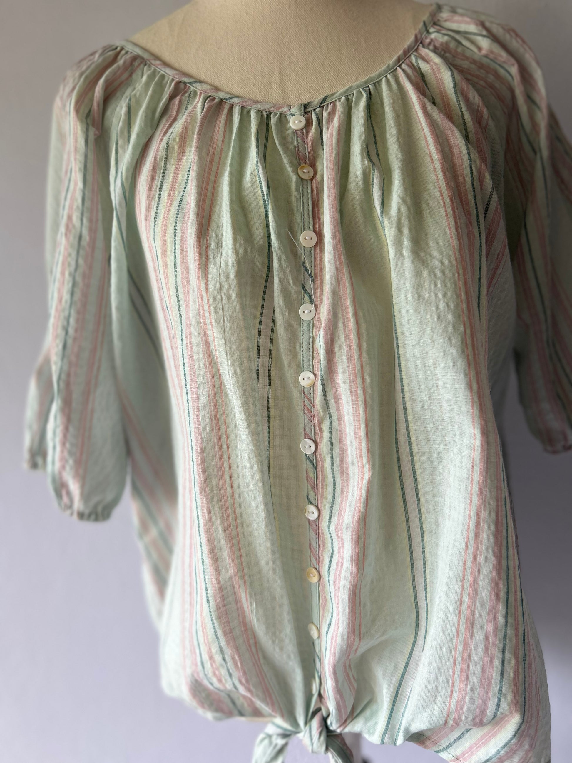 Light and effortless, this pastel striped blouse brings a soft touch of vintage charm to your wardrobe. Designed with a relaxed fit, button-up front, and tie hem, it’s perfect for creating a laid-back yet feminine look. The subtle mint green base with pink and white stripes adds a gentle, summery vibe.