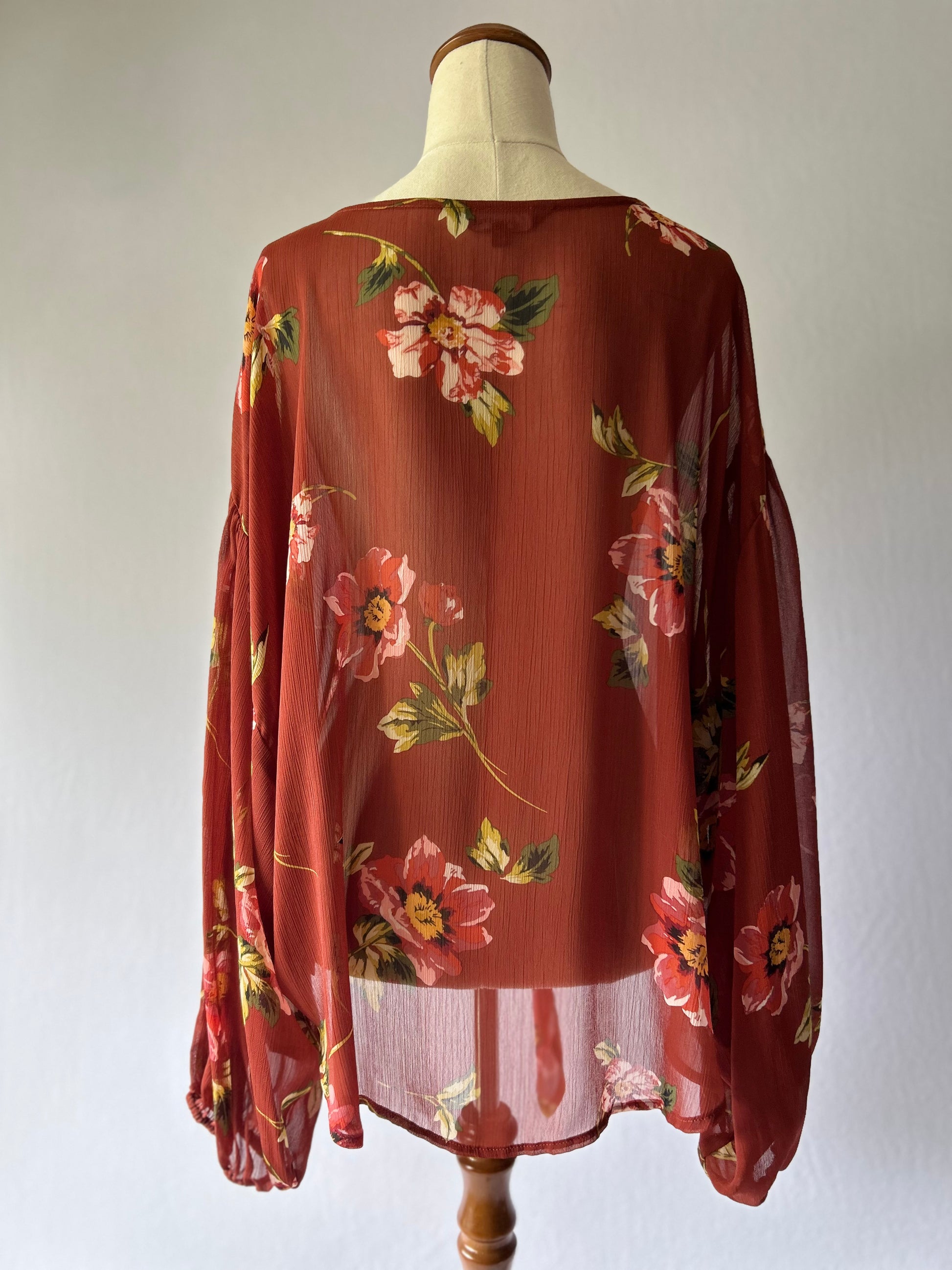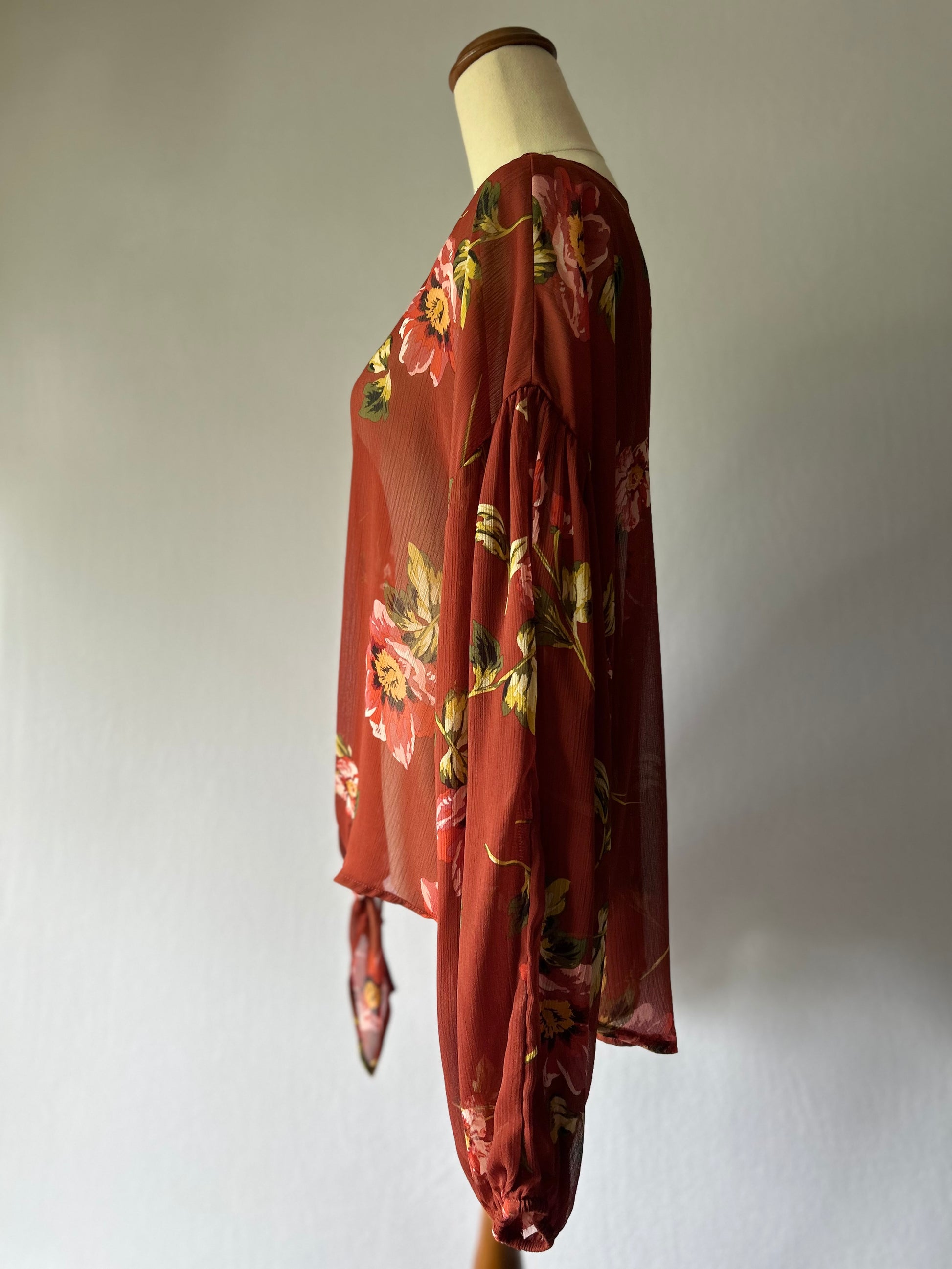 Beautiful terracotta blouse featuring a delicate floral print. Made from soft polyester, this flowy and comfortable piece adds warmth and elegance to any outfit. Perfect for casual days or dressing up with accessories for a chic look.