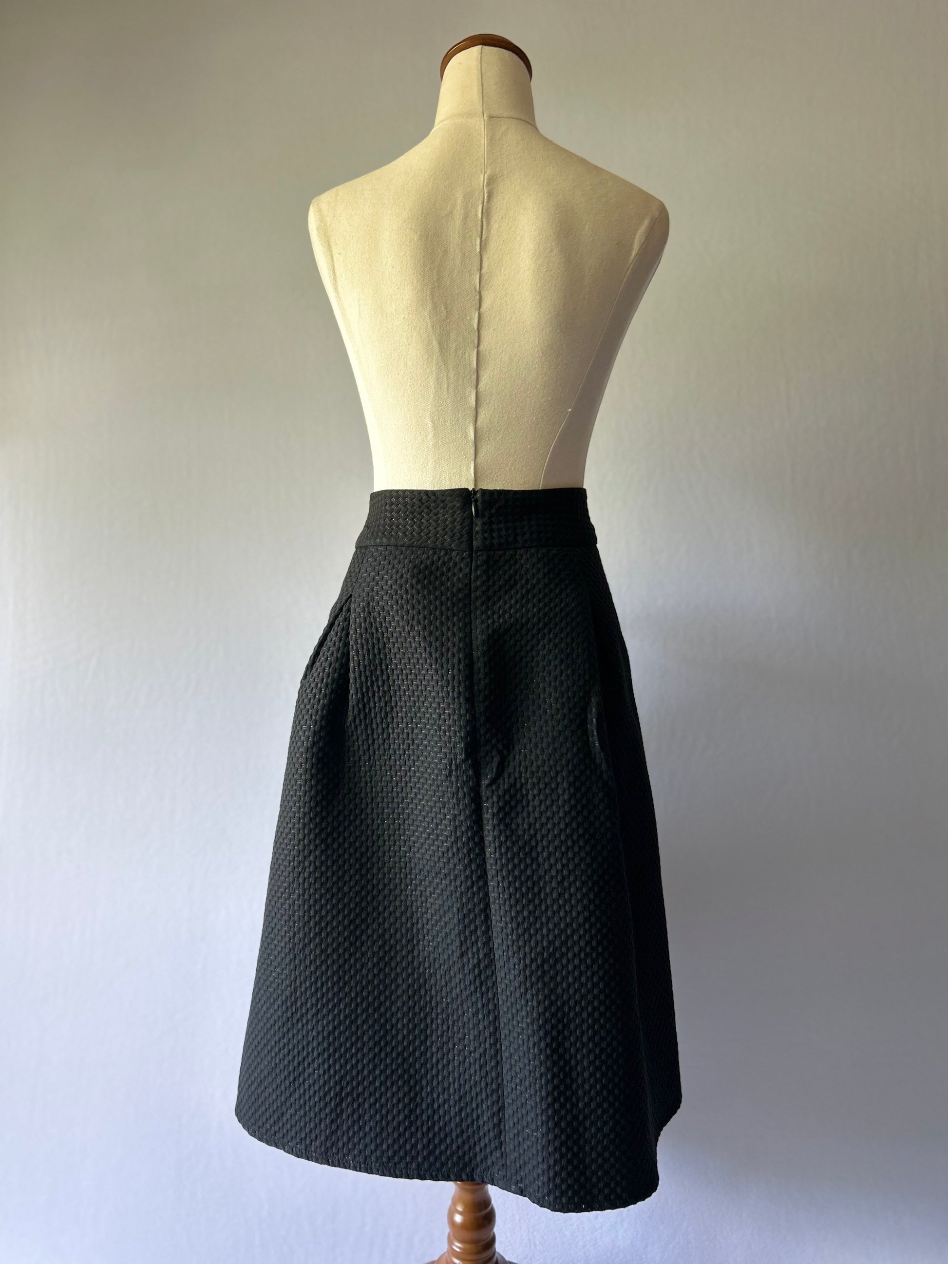 Elegant textured black skirt with a subtle metallic finish, crafted from a premium blend of 45% cotton, 29% polyester, 19% nylon, and 7% metallised fibre. Designed with a structured silhouette and soft pleats that flatter every figure, making it perfect for both workwear and evening occasions.