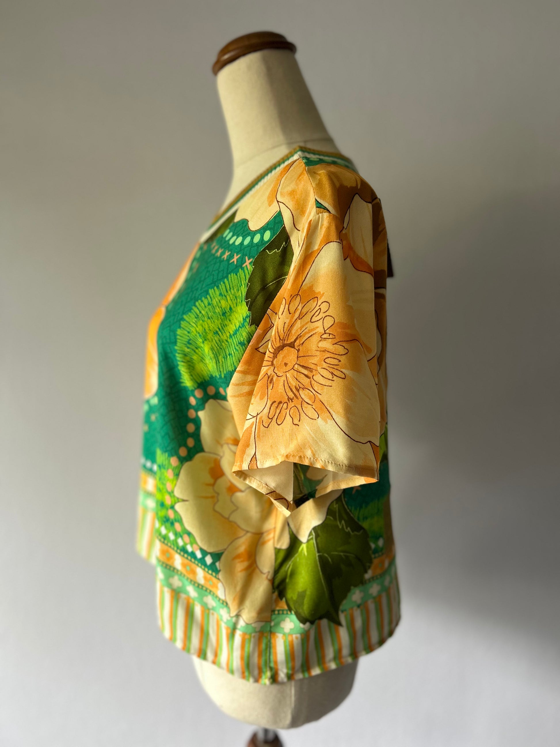 This stunning, New with Tag cropped top is tagged as a size M (Medium) and was Made in Brazil. It features a vibrant, colourful tropical floral and graphic print in shades of orange, green, and yellow, perfect for a bold summer look. The top has a comfortable, slightly boxy silhouette and a rounded neckline finished with a contrasting ribbed trim. Crafted from 100% Viscose, the fabric is lightweight and drapes beautifully. This piece is ideal for pairing with high-waisted shorts or skirts for a fun, warm-weather ensemble.