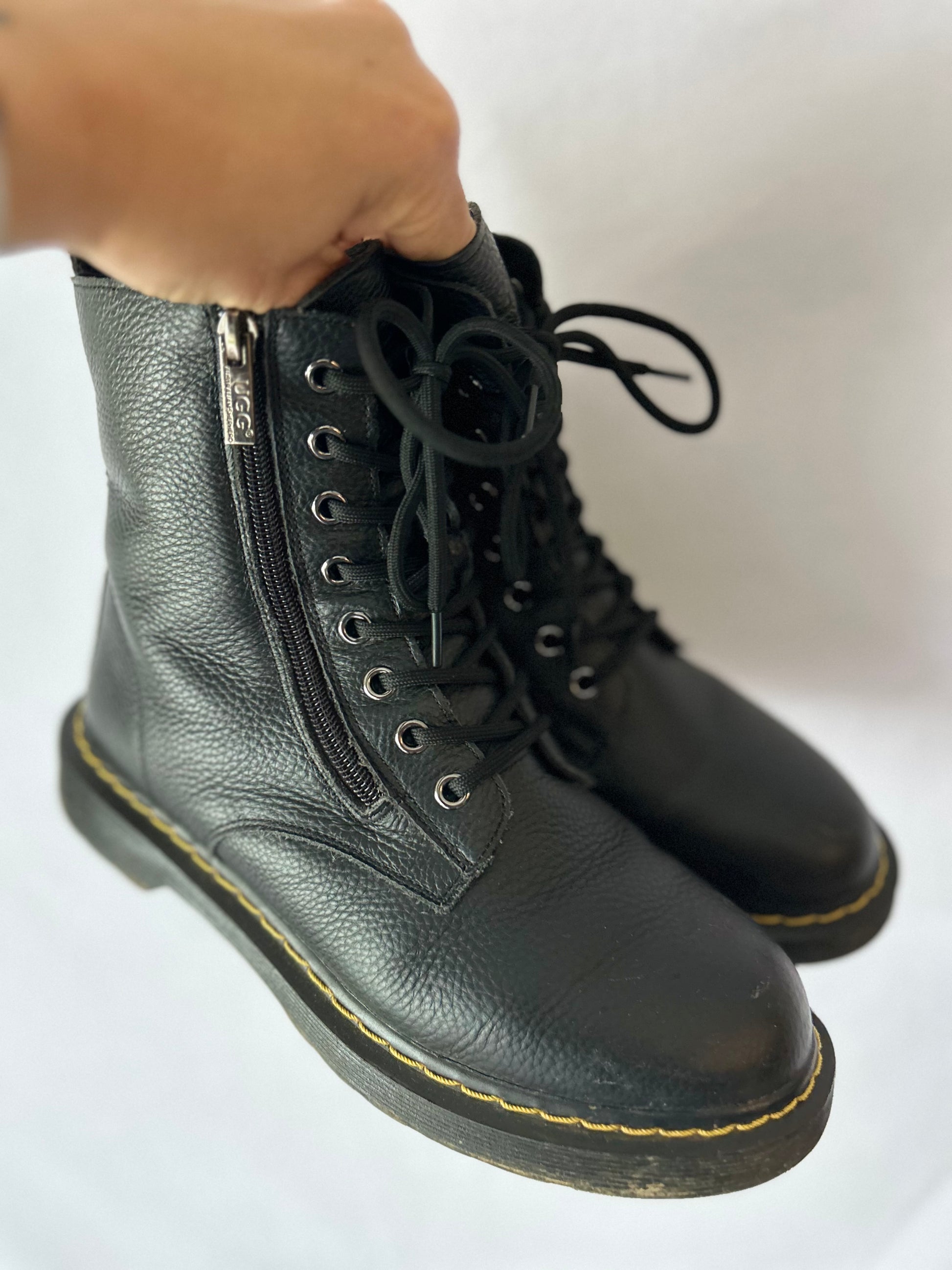 Step out in timeless style with these UGG black leather combat boots, designed for both comfort and edge. Made from durable grained leather, they feature a practical side zip closure for easy wear, lace-up front for adjustable fit, and the iconic yellow stitching detail on the sole. Inside, the soft sheepskin/shearling lining keeps your feet warm and cozy, making them perfect for cooler seasons.