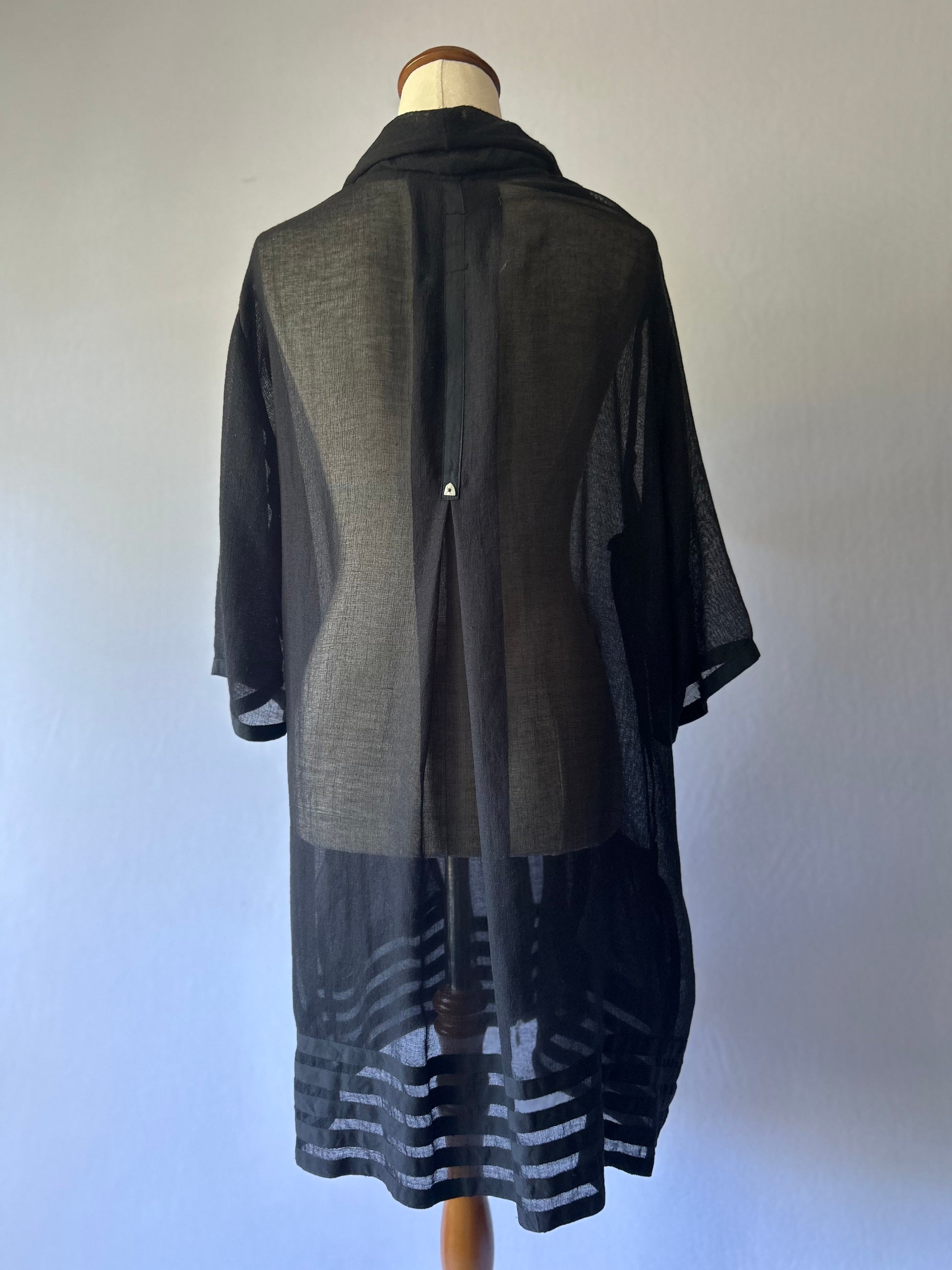 Chic and lightweight, this Verge jacket is designed in New Zealand with signature attention to detail. Crafted from soft sheer polyester, it features a zip-up front, gathered waistline, and front pockets for an effortless, modern silhouette. The unique striped hem adds a subtle statement touch — perfect for layering over simple tops or dresses.