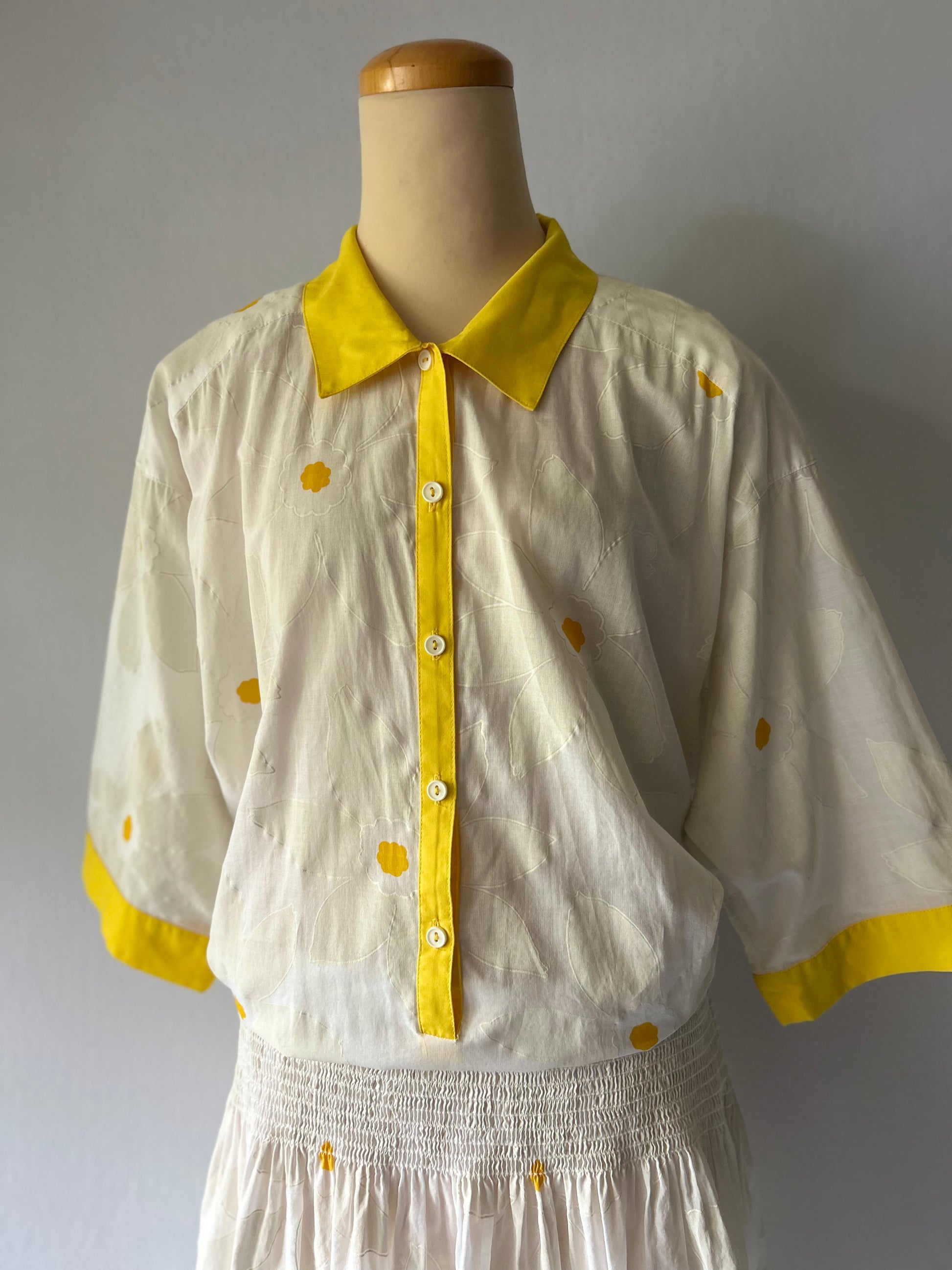 This gorgeous vintage-style Cinnamon dress, proudly Made in New Zealand, is tagged as a size 14. It features a cheerful white base with a subtle textured daisy/floral jacquard pattern woven into the fabric. The design is highlighted by bold yellow accents on the polo collar, the three-quarter sleeves, and the front buttons, giving it a playful 80s/90s aesthetic. The top half is loose-fitting (dolman sleeve style) and blouses slightly over the shirred, elasticated waistline, which flows into a full, midi-length skirt. Made from breathable Cotton, this dress is perfect for summer events or garden parties.