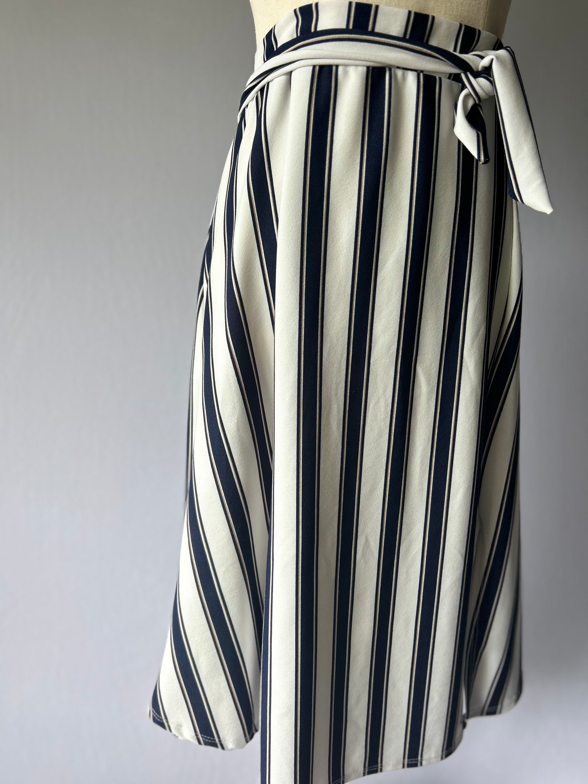 Add a nautical touch to your wardrobe with this white and navy striped skirt. Designed in a flattering straight cut, this piece is made from lightweight polyester fabric, offering comfort and easy wear. Its classic striped pattern makes it versatile for both casual and smart-casual looks – pair it with a simple tee for relaxed style or a blouse for a polished outfit.