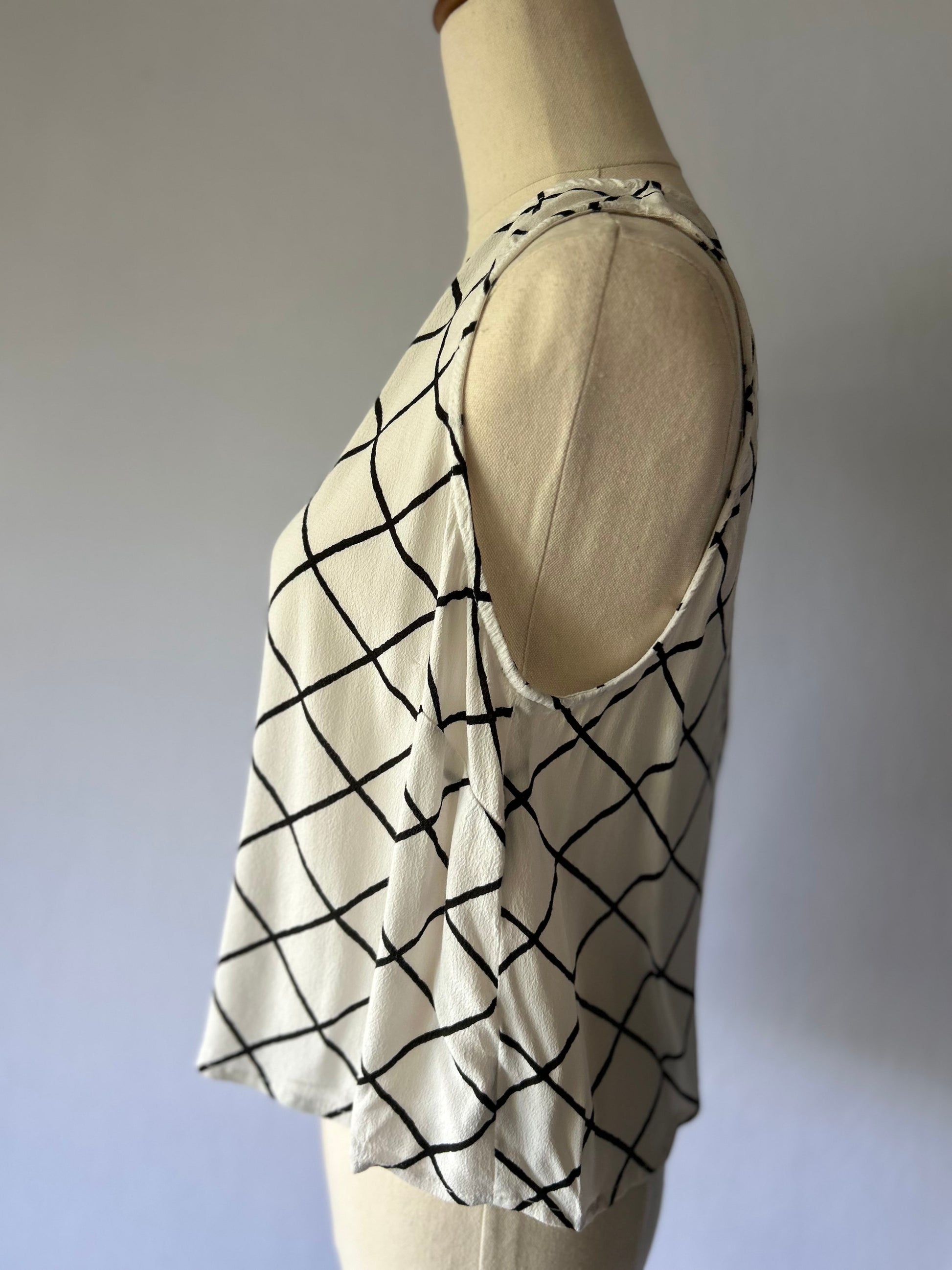 Elevate your everyday look with this chic white tank top featuring a bold black geometric print. Crafted from 100% viscose, it offers a lightweight, breathable feel and effortless drape. Perfect for layering or styling solo, this versatile piece transitions easily from casual outings to polished ensembles.