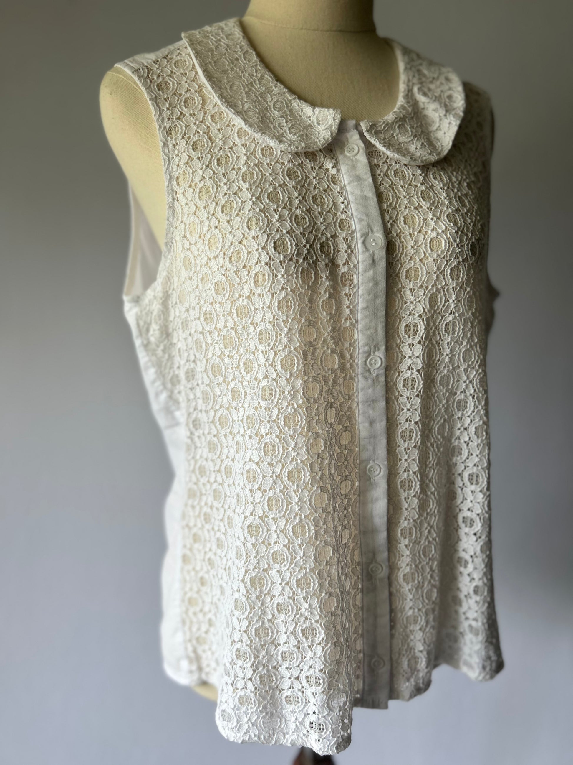 Add a touch of feminine elegance to your wardrobe with this beautiful white lace sleeveless blouse. Featuring a delicate Peter Pan collar and a classic button-down front, this top is perfect for layering or wearing on its own for a chic and timeless look.