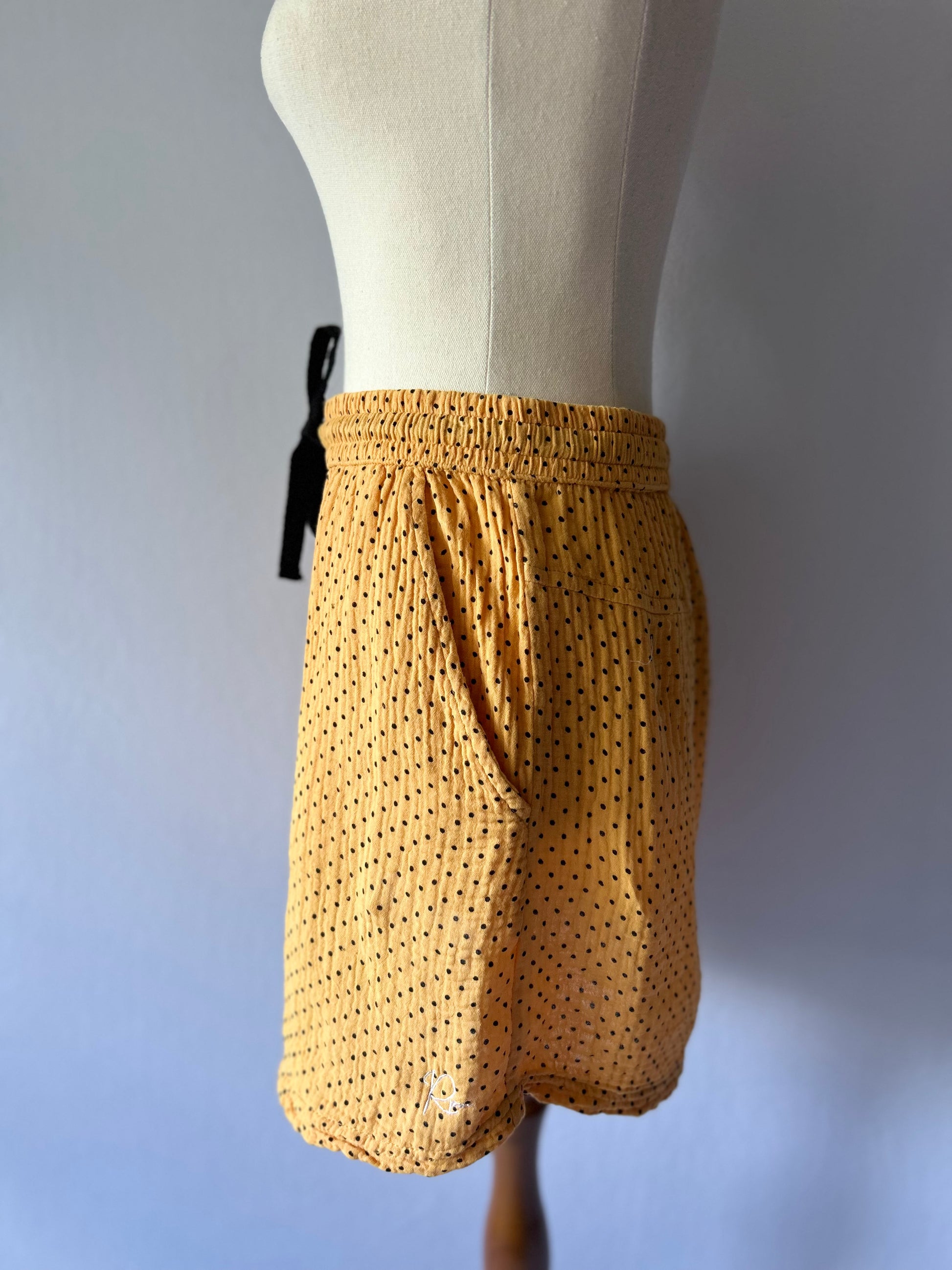 This charming, lightweight skirt is tagged as a size XS. It features a soft, mustard yellow shade accented with a delicate black polka dot pattern. The skirt has a flattering bubble silhouette that creates a fun, voluminous look. Designed for comfort, it includes a wide, shirred elastic waistband and is finished with a decorative black ribbon drawstring at the front. Crafted entirely from 100% Cotton, this piece is perfect for warm weather, offering excellent breathability and a casual, playful style.