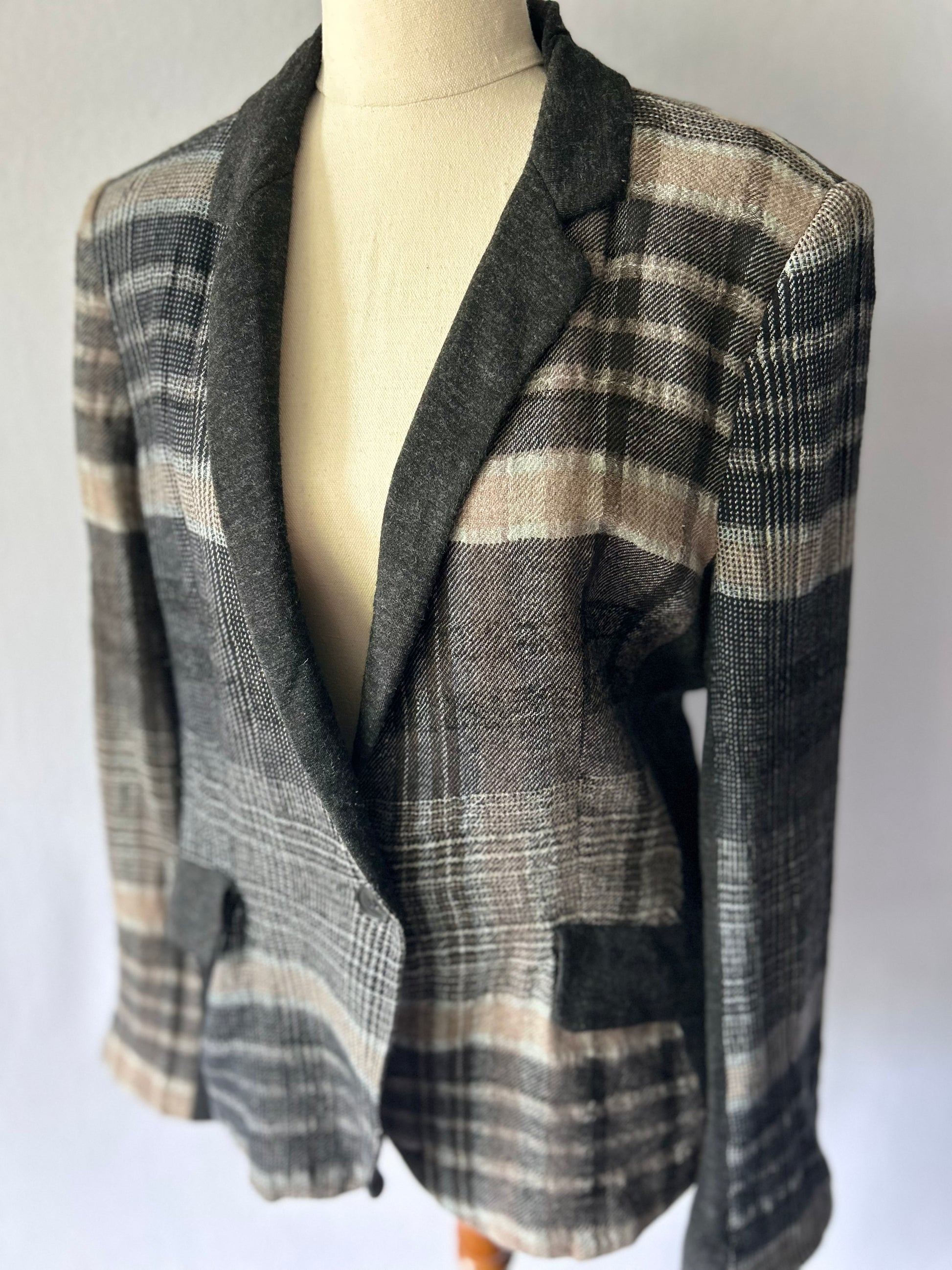 What makes this piece truly special is its high-quality blend of Wool, Linen, and Cotton, providing both warmth and breathability. The design features contrasting charcoal grey lapels and pocket flaps, adding a modern, "editorial" twist to the traditional blazer silhouette. With a soft cotton-blend lining, it offers a structured yet comfortable fit that transitions perfectly between seasons.