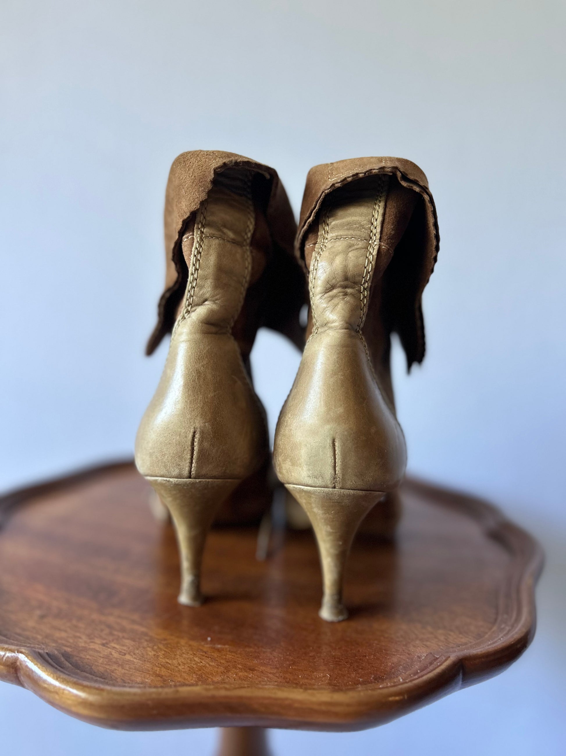 The design is elevated by a classic lace-up front and a unique, scalloped-edge fold-over collar that adds a touch of Victorian-inspired charm. Set on a slender, comfortable kitten heel, these boots offer the perfect amount of lift while remaining wearable for all-day elegance. The pointed toe and structured silhouette create a polished finish that pairs perfectly with everything from floral midi dresses to tailored trousers.